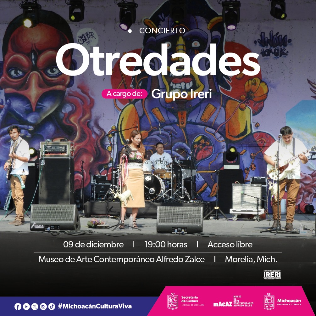 Morelia, Michoacán, 7 de diciembre 2023.- La Secretaría de Cultura de Michoacán (Secum) invita a disfrutar del concierto gratuito Otredades, a cargo del Grupo Ireri, el próximo sábado 9 de diciembre, a las 19:00 horas, en el Museo de Arte Contemporáneo Alfredo Zalce (MACAZ).