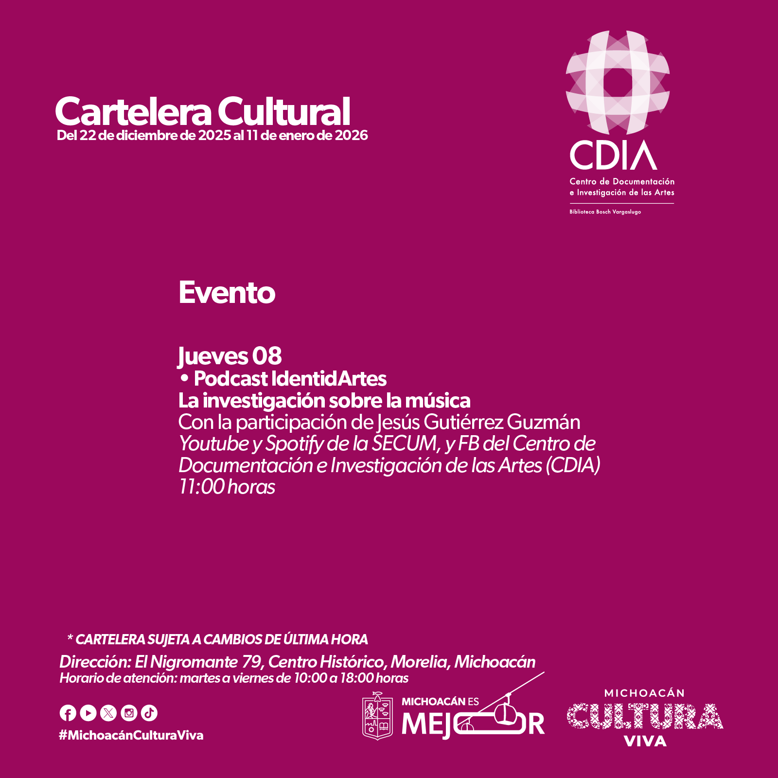 Youtube y Spotify de la SECUM, y FB del Centro de Documentación e Investigación de las Artes (CDIA)