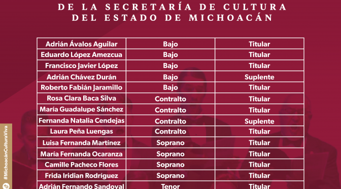 Morelia, Michoacán, 24 de febrero de 2026.- La Secretaría de Cultura de Michoacán (Secum) dio a conocer los resultados de la convocatoria del Coro de la Secum 2026, agrupación que representará al estado durante este año en diversas actividades artísticas y culturales. La selección se realizó con base en la audición llevada a cabo el […]