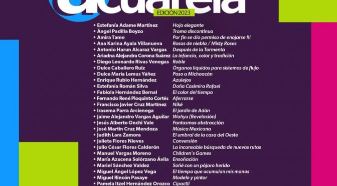 La ganadora se dará a conocer en la exposición del 24 de noviembre Morelia, Michoacán, 15 de noviembre de 2023.- La Secretaría de Cultura de Michoacán (Secum) da a conocer las obras seleccionadas de la convocatoria XXIII Salón Estatal de la Acuarela en su edición 2023, con participaciones en Acuarela Realista, Abstracta y de Lenguaje […]