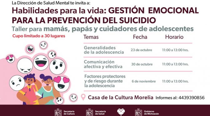 Morelia, Michoacán, 24 de octubre del 2022.- Como parte de la Estrategia Nacional para la Prevención del Adicciones (ENPA), la Secretaría de Cultura de Michoacán (Secum), en coordinación con la Secretaría de Salud (SSM), realizará un taller de Habilidades para la vida: Gestión Emocional para la Prevención del Suicidio, los días 23, 30 octubre, y […]