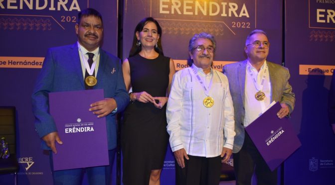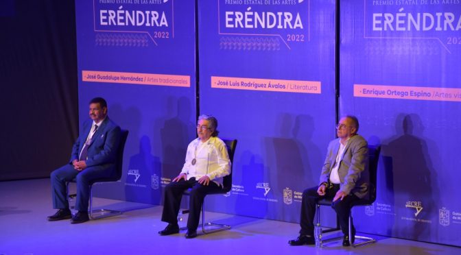 • José Luis Rodríguez Ávalos, Enrique Ortega Espino y José Guadalupe Hernández Cano, recibieron en este año el galardón. Morelia, Michoacán, 12 de octubre del 2022.- El gobernador Alfredo Ramírez Bedolla entregó a José Luis Rodríguez Ávalos, Enrique Ortega Espino y José Guadalupe Hernández Cano, el 18° Premio Estatal de las Artes Eréndira 2022, en […]