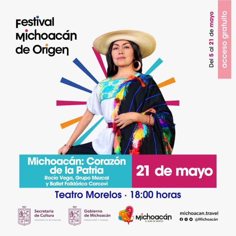 • Cartelera cultural del Festival Michoacán de Origen del 16 al 21 de mayo Morelia, Michoacán, 16 de mayo de 2022.- La Secretaría de Cultura de Michoacán (SECUM) continúa celebrando el Festival Michoacán de Origen esta semana con actividades artísticas y culturales para toda la familia, como: fandango, jazz, teatro infantil, el Ballet Folklórico Corcovi […]