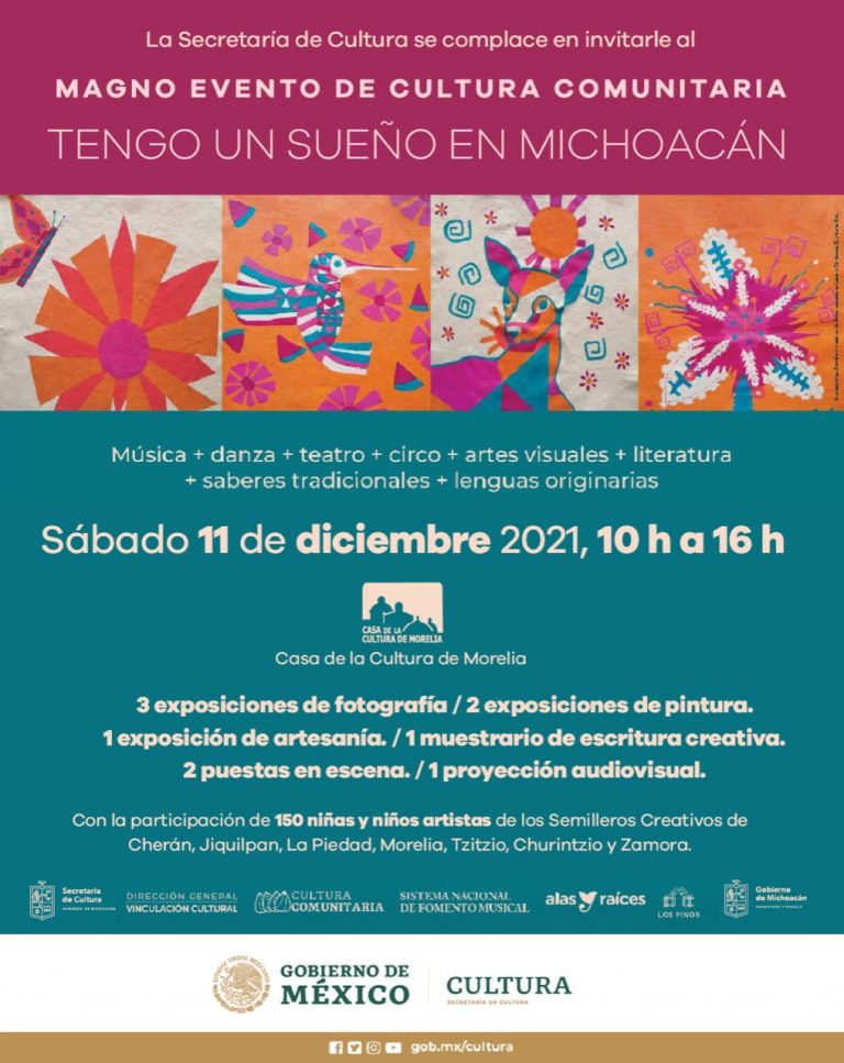 Tres exposiciones fotográficas, dos exposiciones de pintura, una exposición de artesanías, un muestrario de escritura creativa, dos puestas en escena y una proyección audiovisual componen “Tengo un Sueño en Michoacán“ magno evento de culturas comunitarias Morelia, Michoacán, 7 de diciembre del 2021.- Este sábado 11 de diciembre, a partir de las 10 y hasta las […]
