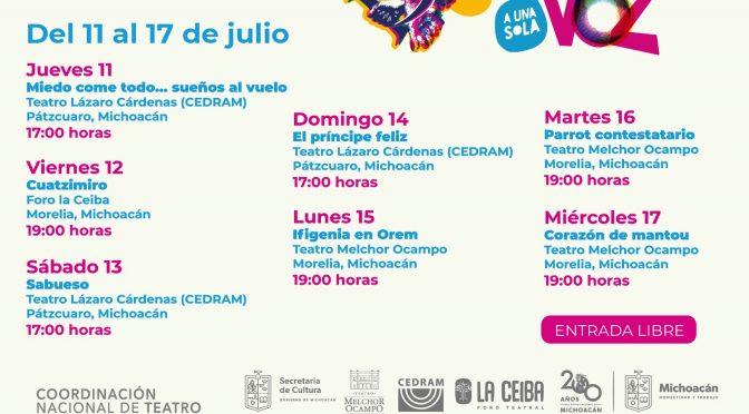 Del 11 al 17 de julio, con acceso libre Morelia, Michoacán, 28 de junio de 2024.- Con siete unipersonales, llega al estado el 19 Festival de Monólogos. Teatro a Una Sola Voz, del 11 al 17 de julio, gracias al trabajo colaborativo de la Secretaría de Cultura, a través del Instituto Nacional de Bellas Artes […]