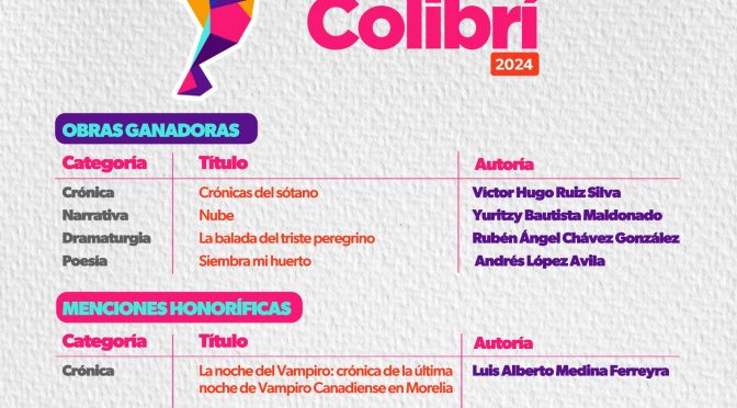 Incrementó en un 75 por ciento el número de participantes, con respecto a la primera edición del 2023 Morelia, Michoacán, 26 de junio de 2024.- La Secretaría de Cultura de Michoacán (Secum) dio a conocer las obras ganadoras de la convocatoria Palabras de Colibrí 2024, la cual tiene como prioridades la publicación de la obra […]