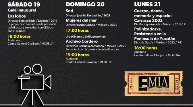 Descargar Programa Programa GeneralEMIA 2022 Morelia Centro Cultural ClavijeroSábado 19 noviembreGala Inaugural 18:00Proyección Especial: Los Lobos(Samuel Kishi, México, 95 min,2019) Domingo 20 de noviembreMorelia, Centro Cultural Clavijero 17:00-Sed (José M. Delgadillo, 4 min, 2021)-Mujeres del MAR (Mario Corona, México, 77 min, 2022)Morelia, Centro Cultural Clavijero 19:00UltraCinema y EMIA presentan:-Archivo Cordero (Gabriela Zamorano, Michoacán, 2021)Conversatorio con […]