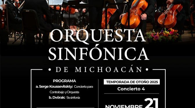 Morelia, Michoacán, 18 de noviembre de 2025.- La Secretaría de Cultura de Michoacán (Secum) invita al cuarto concierto de temporada de la Orquesta Sinfónica de Michoacán (Osidem) este viernes 21 de noviembre a las 19:30 horas en el Teatro Melchor Ocampo, con un programa que incluye el Concierto para Contrabajo y Orquesta de Serge Koussevitzky […]