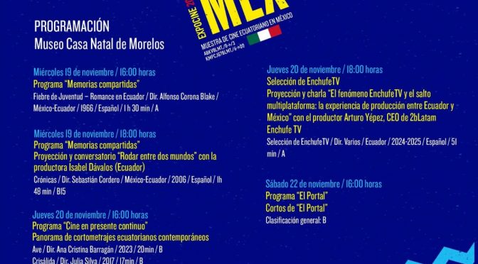Morelia, Michoacán, 19 de noviembre de 2025.- Hoy inicia en Morelia ECU–MEX ExpoCine, una muestra que reúne cine de Ecuador y México para impulsar el intercambio cultural entre ambos países. La Secretaría de Cultura de Michoacán (Secum) presenta por primera vez esta propuesta en la capital, con funciones gratuitas hasta el 22 de noviembre en […]