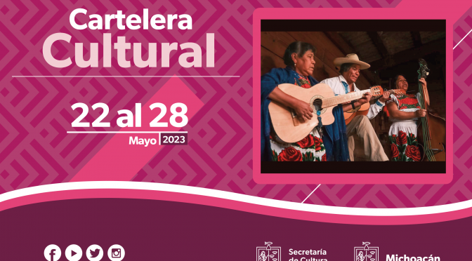 Descargas: Secretaría de Cultura del Estado de Michoacán (SECUM) Cartelera Cultural del 22 al 28 de mayo de 2023 LUNES 22 Obra de teatro ¿Qué sueña el cielo cuando somos desierto? 17:00 horas Centro Dramático de Michoacán en Pátzcuaro Inicio del taller Técnicas Limón y Humphrey 18:00 horas Centro Regional de las Artes de Michoacán […]