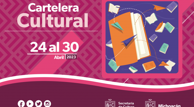 Descargas: Secretaría de Cultura del Estado de Michoacán (SECUM) Cartelera Cultural del 24 al 30 de abril de 2023 LUNES 24 Feria Intercultural del Libro de Tacámbaro Del 21 al 28 de abril Plaza Benito Juárez / Tacámbaro Semana del Murciélago en Morelia Del 24 al 26 de abril 10:00 horas Patio de la Magnolia […]