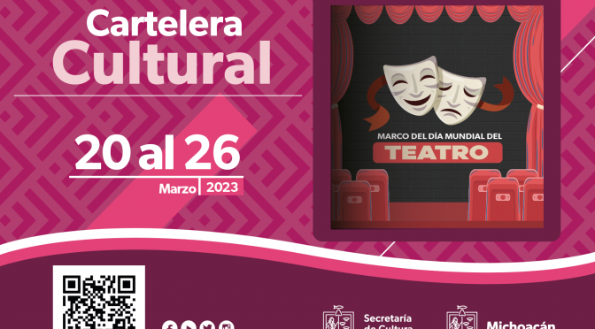 Descargas: Secretaría de Cultura del Estado de Michoacán (SECUM) Cartelera Cultural del 20 al 26 de marzo de 2023 MARTES 21 Festival AmoreliaJazz 2da. Edición 10:00 horas Auditorio / Centro Cultural Clavijero / Morelia Conferencia “El auto eléctrico: ¿alternativa ecológica?” 17:00 horas Auditorio Gertrudis Bocanegra / Centro Cultural Antiguo Colegio Jesuita / Pátzcuaro MIÉRCOLES 22 […]