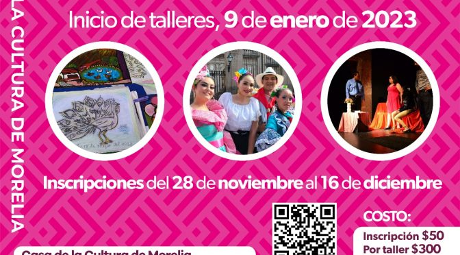 Morelia, Michoacán, 12 de noviembre del 2022.- Bajo la misión de fomentar y difundir las disciplinas de las bellas artes, la Casa de la Cultura de Morelia continúa trabajando a favor de la sociedad; por ello, reitera la invitación a inscribirse en sus más de 140 talleres, que se ofertan en el ciclo de enero- […]