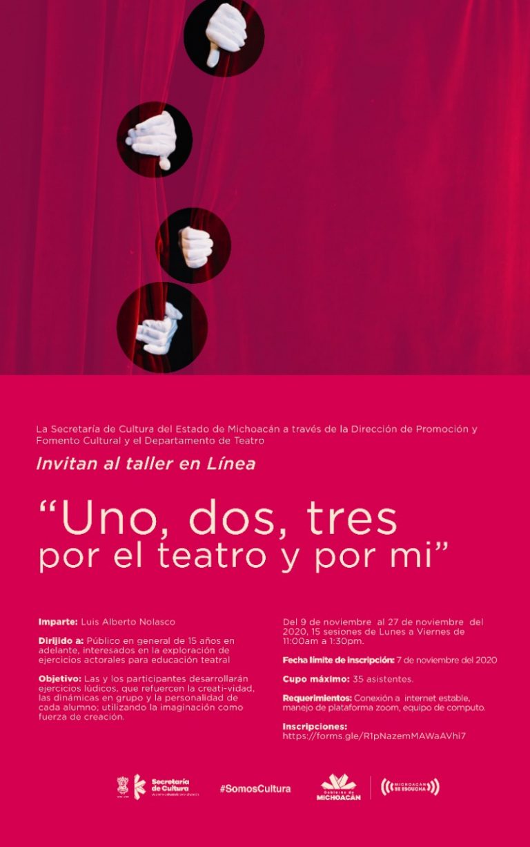 Morelia, Michoacán, a 22 de octubre de 2020.- La Secretaría de Cultura de Michoacán (Secum) invita al público en general al taller gratuito en línea “Iniciación al teatro”. Se llevará a cabo los lunes, miércoles y viernes, del 2 al 27 de noviembre. El registro será en línea a través https://forms.gle/jBrvT7XXTiXwetHw9 Esta actividad será coordinada […]