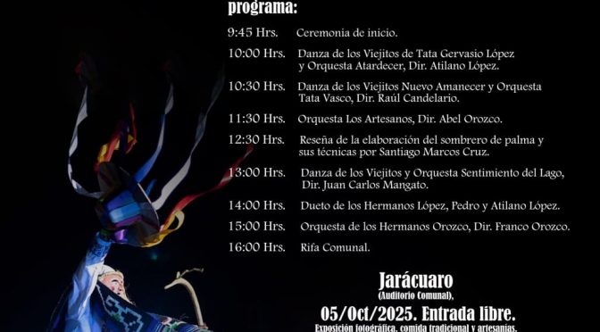 Erongarícuaro, Michoacán, 5 de octubre de 2025.- La Secretaría de Cultura de Michoacán (Secum) invita al primer Festival Artístico, Artesanal y de Comida Tradicional “Xarhakuarhu Anapu P’indekuecha” (Jarácuaro Vive sus Tradiciones), que se llevará a cabo en el Auditorio Comunal de esta comunidad purépecha, de 10:00 a 18:00 horas con entrada gratuita. El programa incluye […]