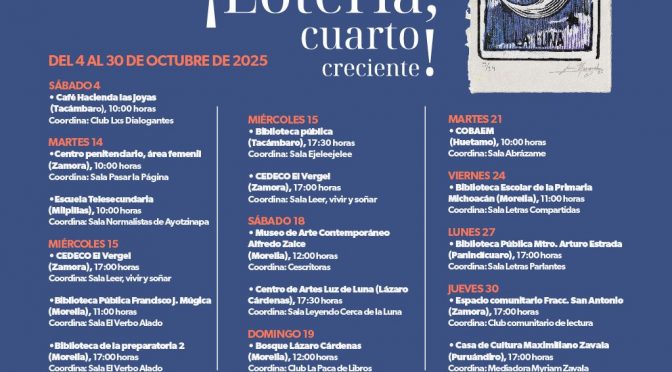 Morelia, Michoacán, 7 de octubre de 2025.- Para conmemorar el Día Mundial de las Escritoras, la Secretaría de Cultura de Michoacán (Secum) realizará durante el mes de octubre, una serie de lecturas comunitarias en diversos municipios del estado. La obra con la que se trabajará es “¡Lotería, cuarto creciente!”, de Margarita Vázquez Díaz, primera mujer […]