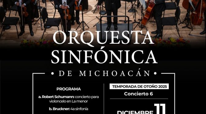 Morelia, Michoacán, 8 de diciembre de 2025.- La Secretaría de Cultura de Michoacán (Secum) invita al sexto concierto de temporada de la Orquesta Sinfónica de Michoacán (Osidem), que se realizará este jueves 11 de diciembre a las 19:30 horas en el Teatro Melchor Ocampo. El programa contempla el Concierto para violonchelo en La menor de […]