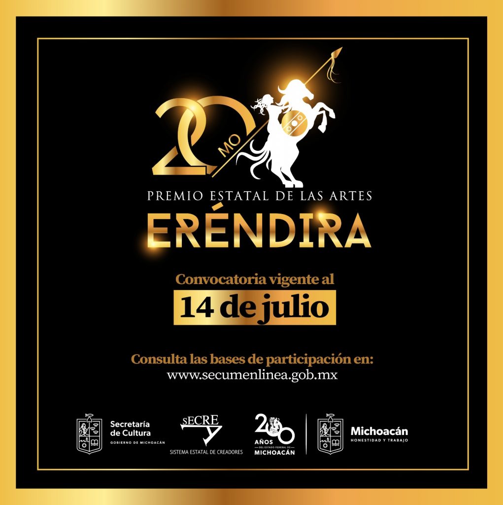 Morelia, Michoacán, 20 de junio de 2024.- Para que más artistas y agrupaciones puedan ser postulados por su amplia trayectoria, la Secretaría de Cultura de Michoacán (Secum) amplía el plazo de la convocatoria del Premio Estatal de las Artes Eréndira 2024, en el marco de su vigésimo aniversario.