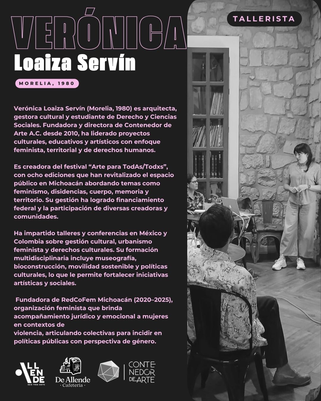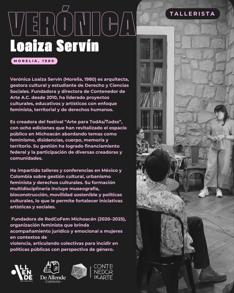 La clínica será impartida por Verónica Loaiza Servín, arquitecta y gestora cultural con amplia trayectoria en diseño, financiamiento y dirección de proyectos artísticos y socioculturales. Fundadora y directora de Contenedor de Arte A.C, ha sido beneficiaria de programas federales; su experiencia integra gestión, fortalecimiento comunitario, políticas públicas, urbanismo feminista y derechos humanos.