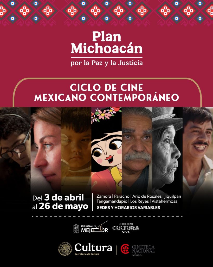 Morelia, Michoacán, 1 de abril de 2026.- La Secretaría de Cultura de Michoacán (Secum), en alianza con la Cineteca Nacional, presenta el Ciclo de Cine Mexicano Contemporáneo, una muestra que se proyectará de manera gratuita del 3 de abril al 26 de mayo en siete municipios del estado.