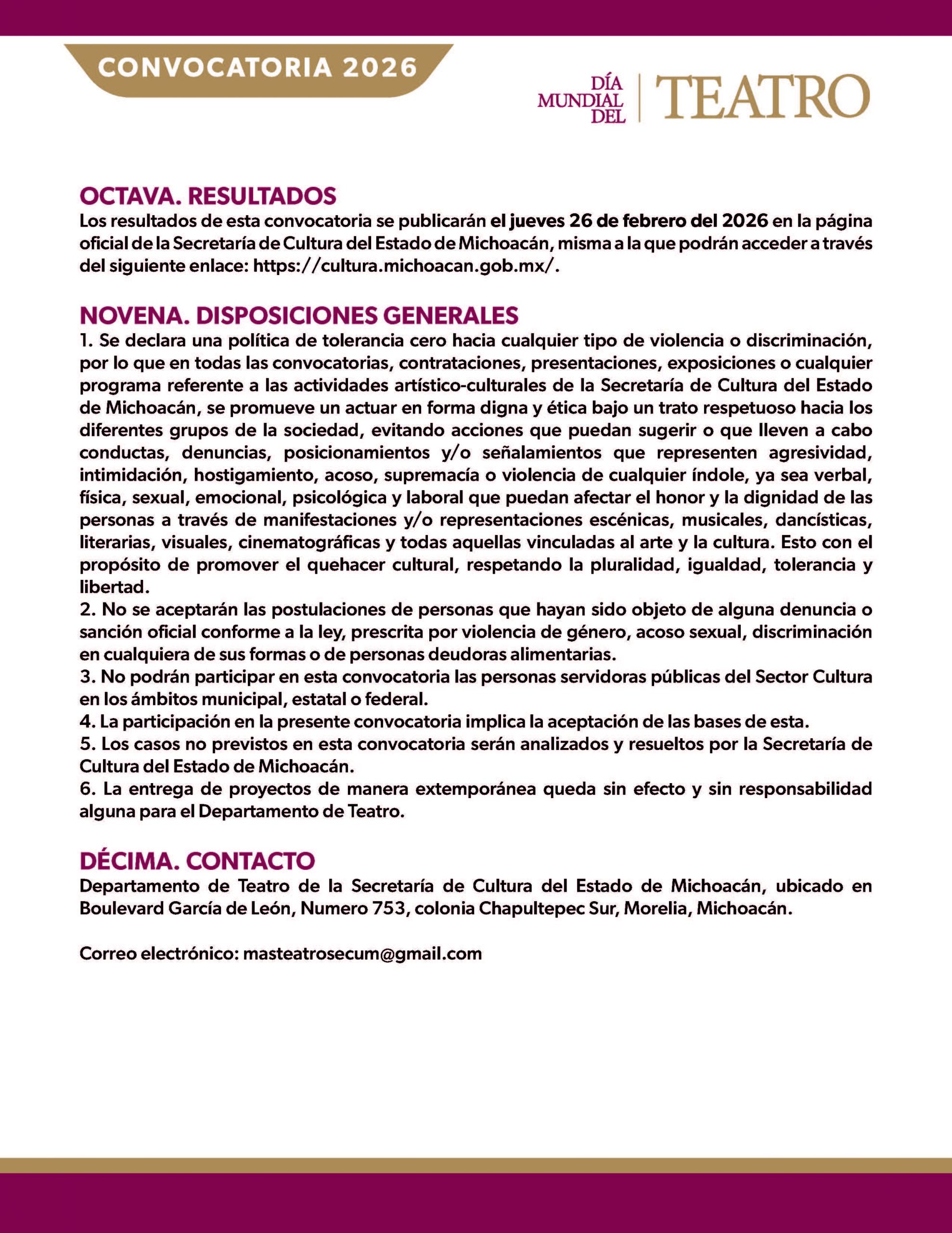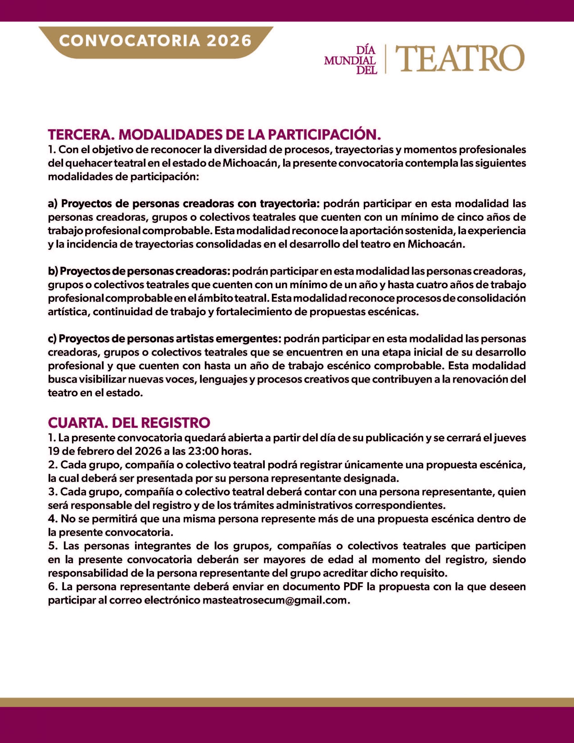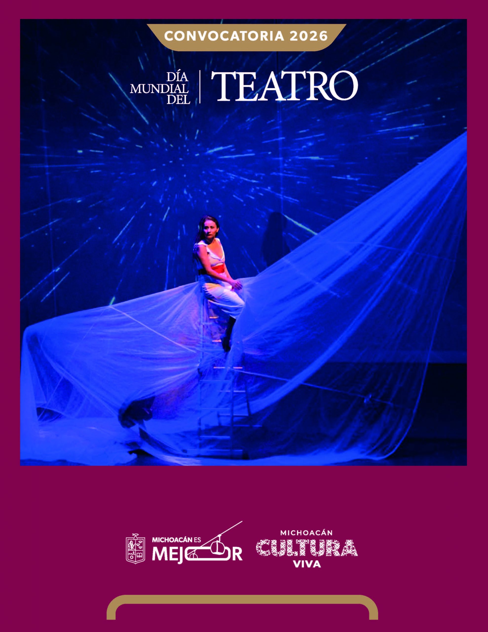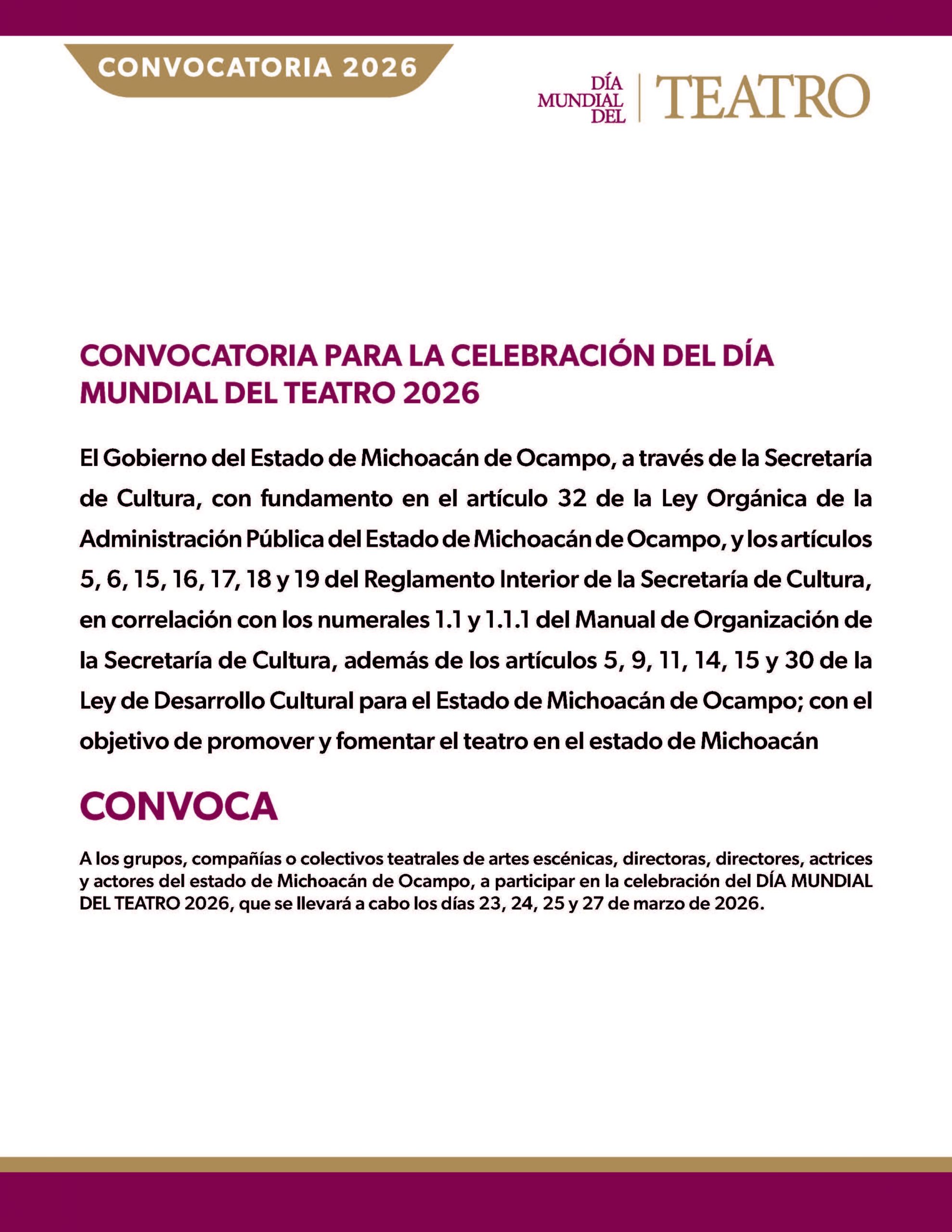 A los grupos, compañías o colectivos teatrales de artes escénicas, directoras, directores, actrices y actores del estado de Michoacán de Ocampo, a participar en la celebración del DÍA MUNDIAL DEL TEATRO 2026, que se llevará a cabo los días 23, 24, 25 y 27 de marzo de 2026.