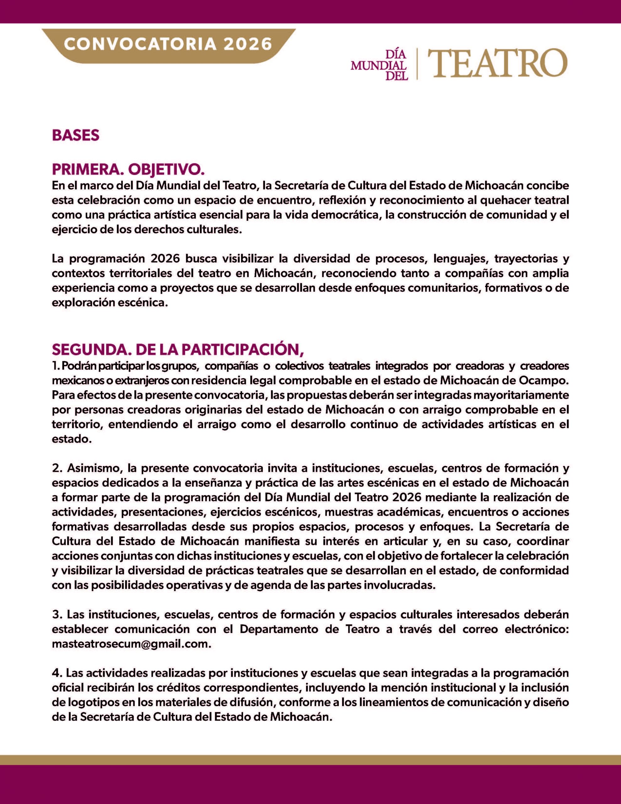 2. Asimismo, la presente convocatoria invita a instituciones, escuelas, centros de formación y espacios dedicados a la enseñanza y práctica de las artes escénicas en el estado de Michoacán a formar parte de la programación del Día Mundial del Teatro 2026 mediante la realización de actividades, presentaciones, ejercicios escénicos, muestras académicas, encuentros o acciones formativas desarrolladas desde sus propios espacios, procesos y enfoques. La Secretaría de Cultura del Estado de Michoacán manifiesta su interés en articular y, en su caso, coordinar acciones conjuntas con dichas instituciones y escuelas, con el objetivo de fortalecer la celebración y visibilizar la diversidad de prácticas teatrales que se desarrollan en el estado, de conformidad con las posibilidades operativas y de agenda de las partes involucradas.