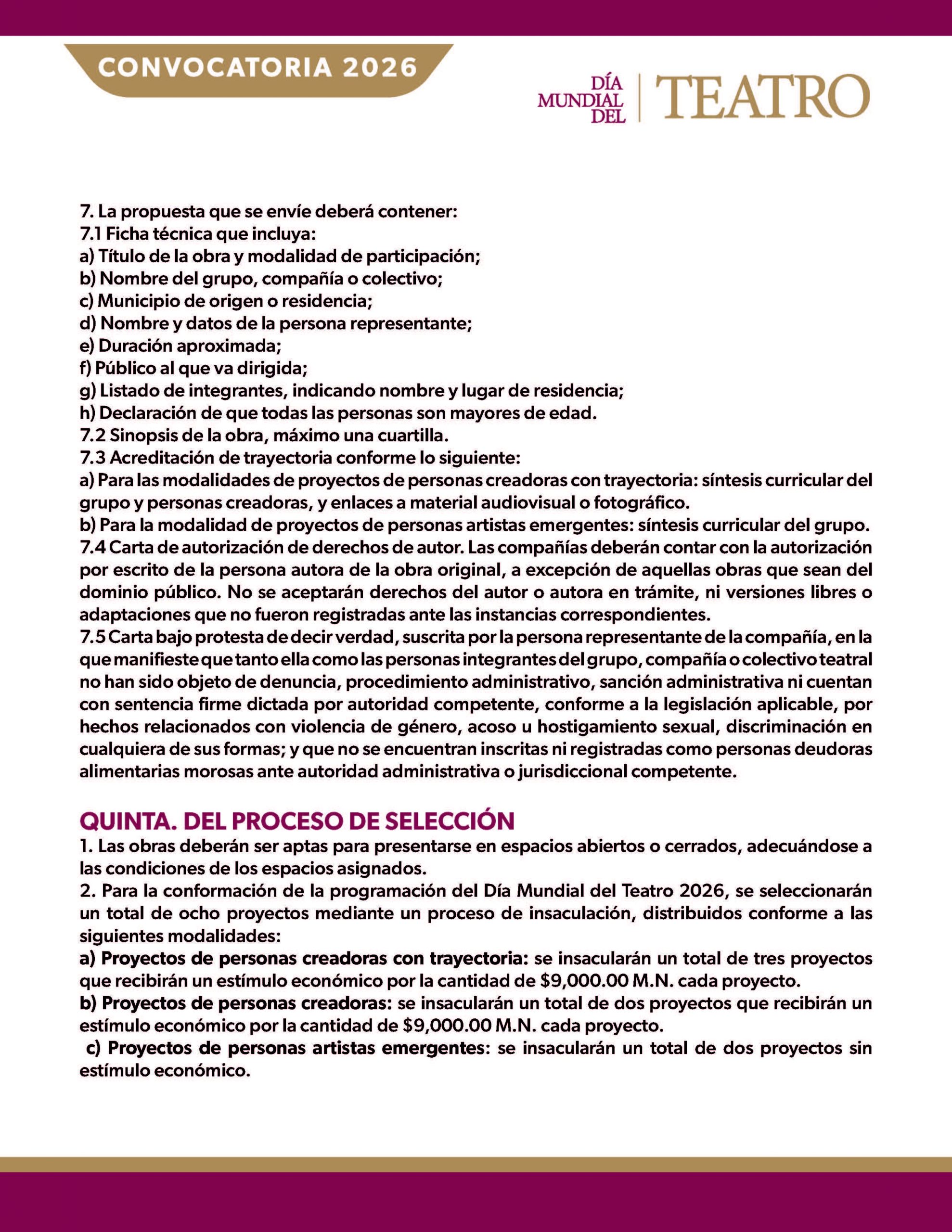 6. La entrega de proyectos de manera extemporánea queda sin efecto y sin responsabilidad alguna para el Departamento de Teatro.
