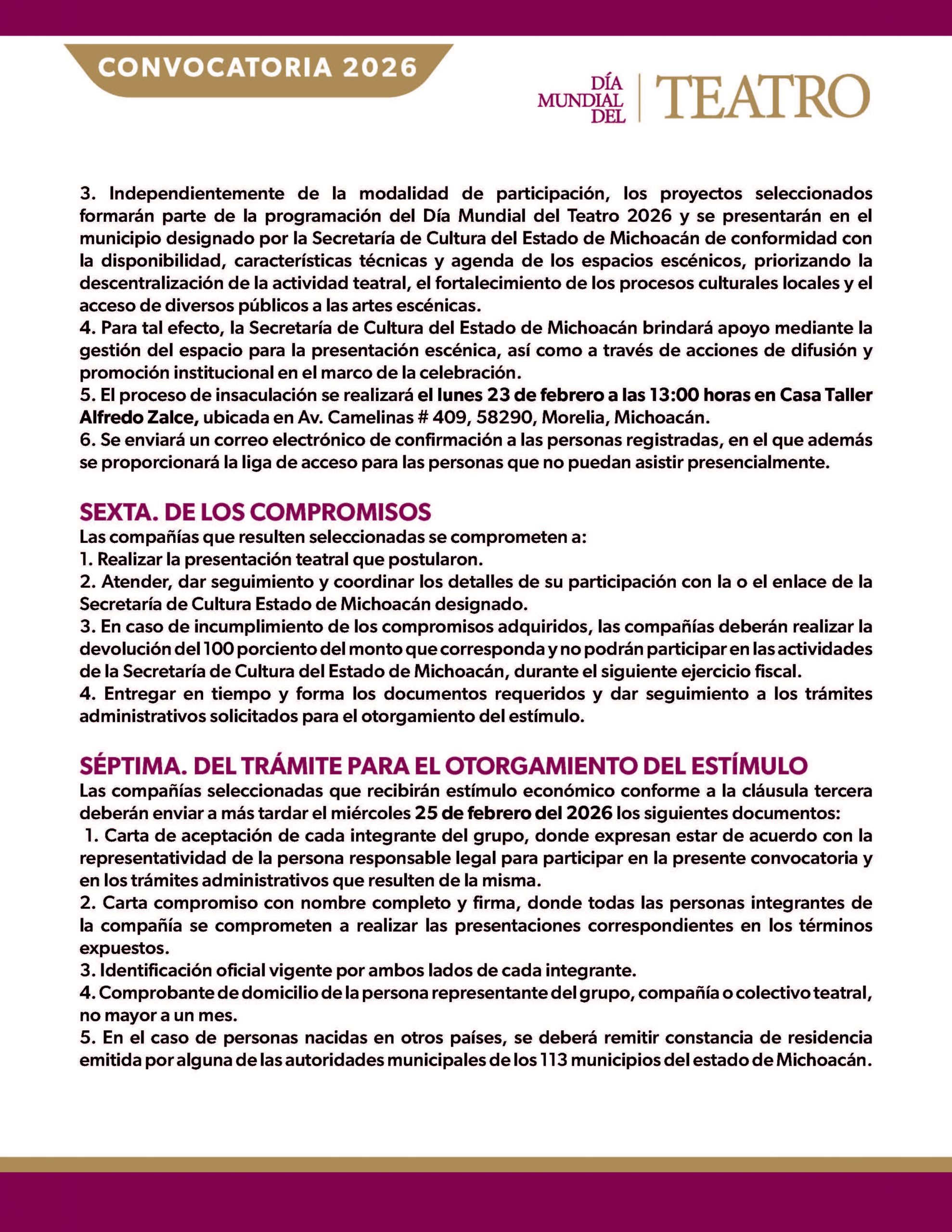 4. Para tal efecto, la Secretaría de Cultura del Estado de Michoacán brindará apoyo mediante la gestión del espacio para la presentación escénica, así como a través de acciones de difusión y promoción institucional en el marco de la celebración.
