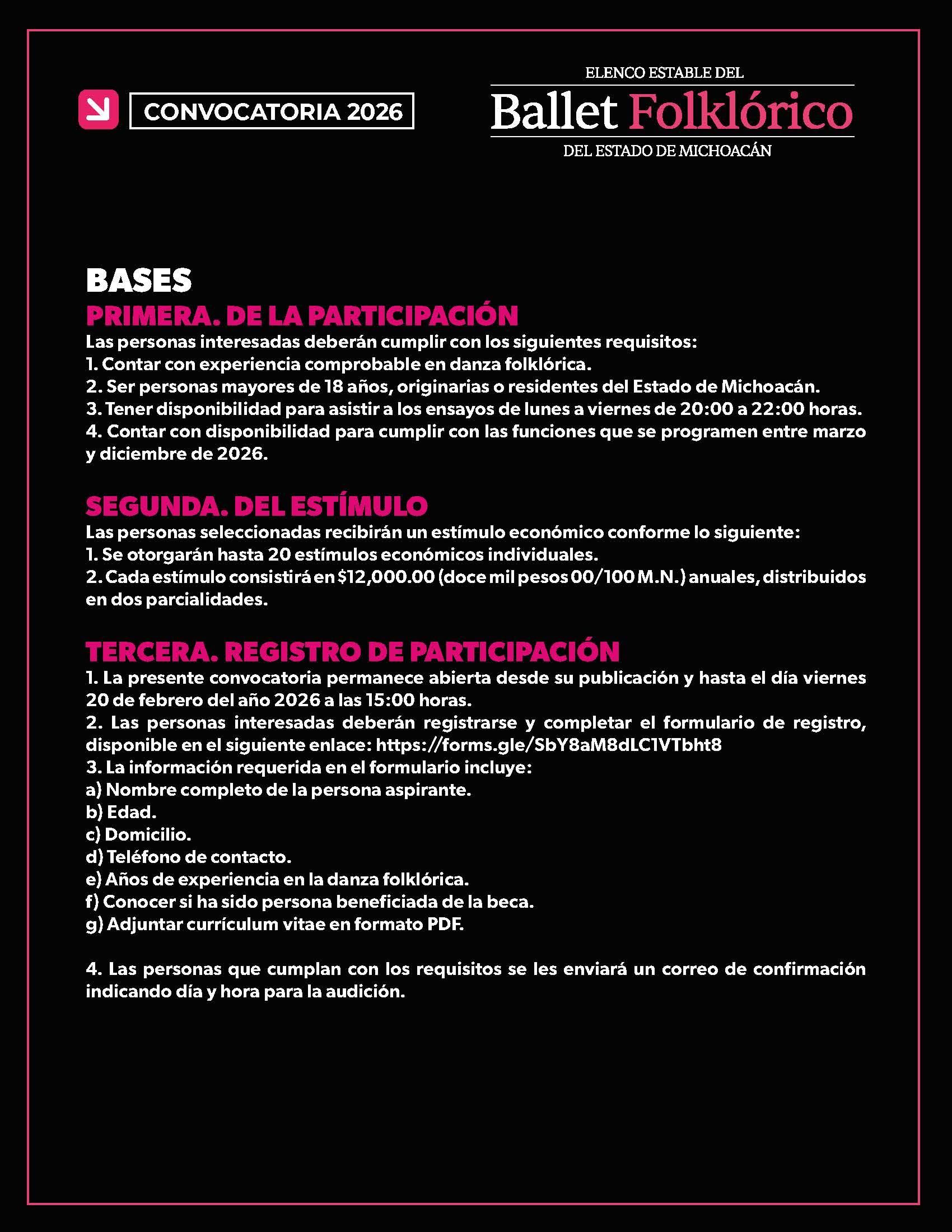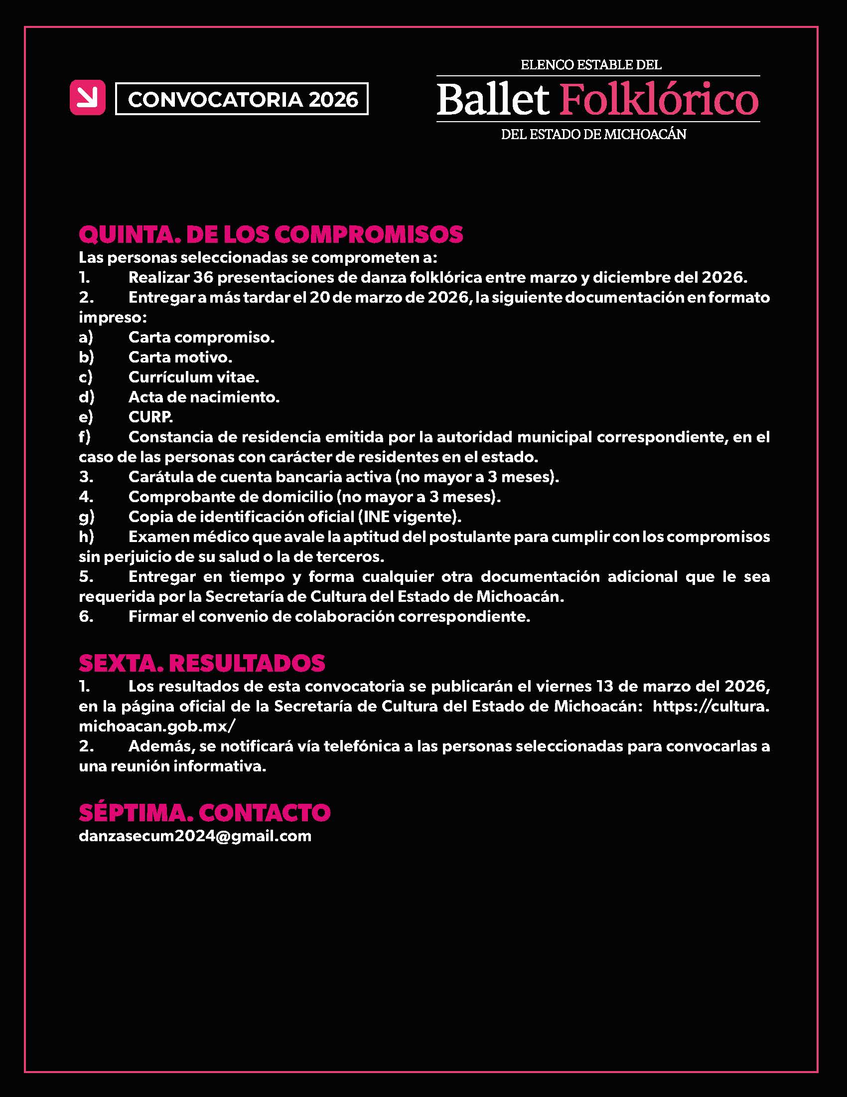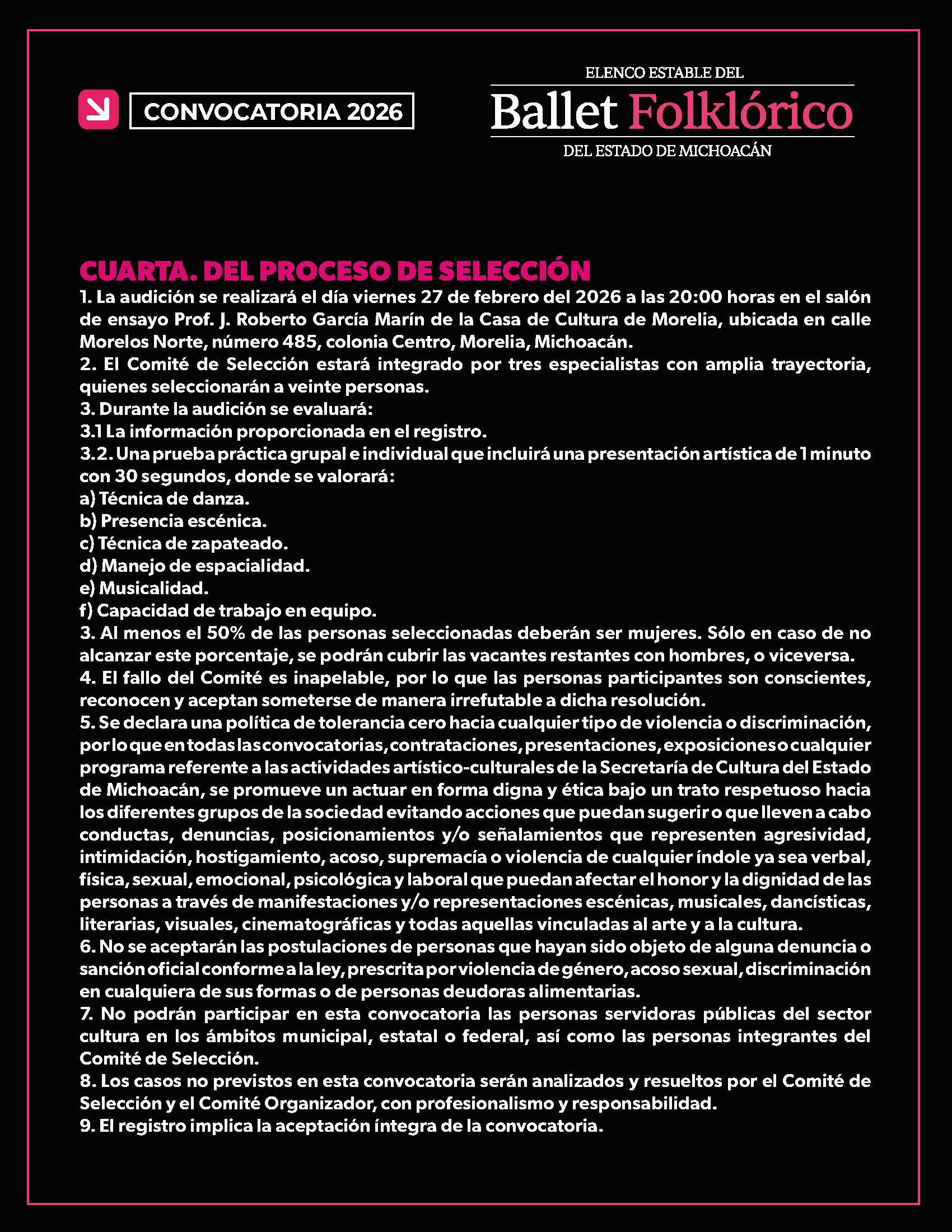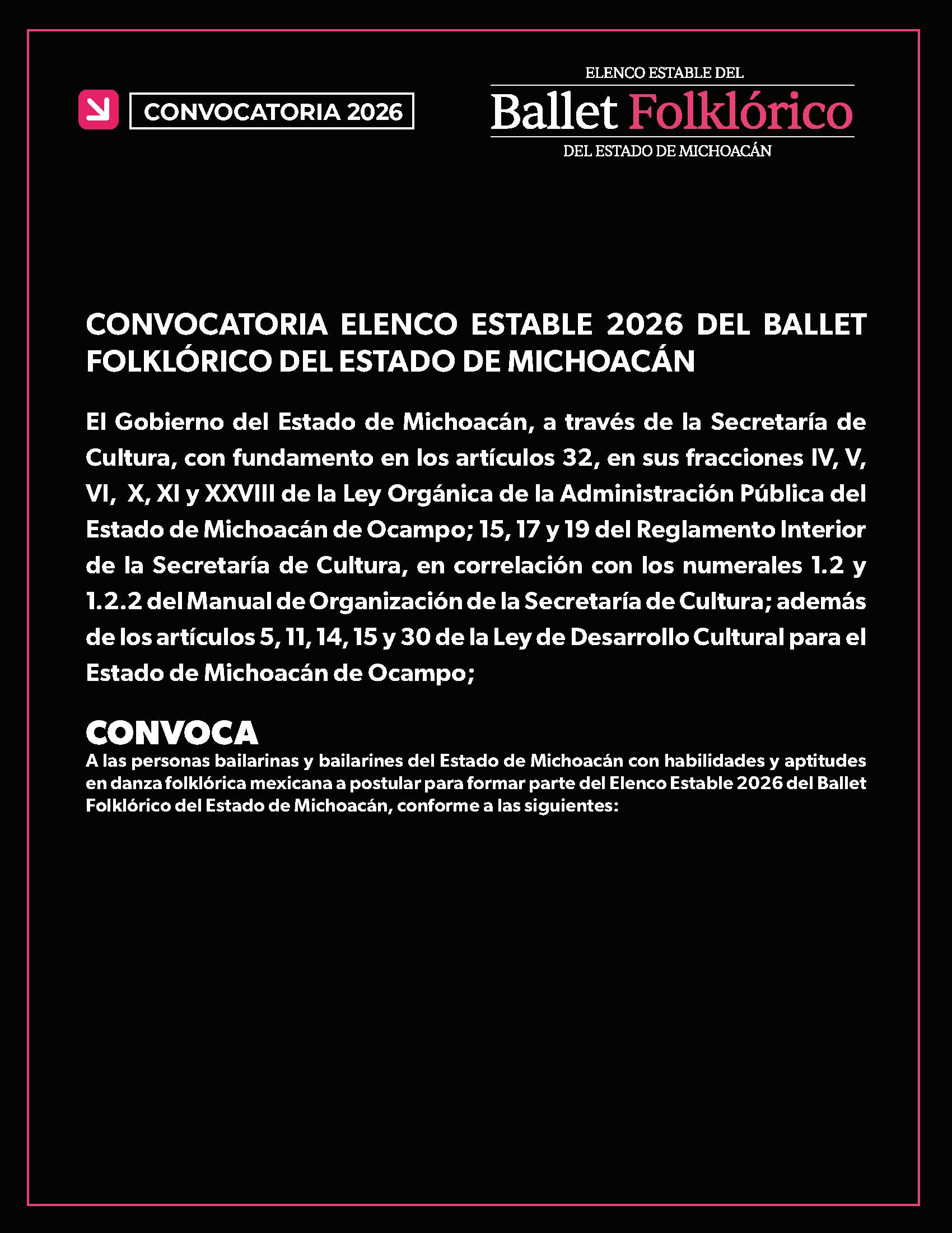 Convocatoria 2026: Elenco estable del Ballet Folklórico del Estado de Michoacán
