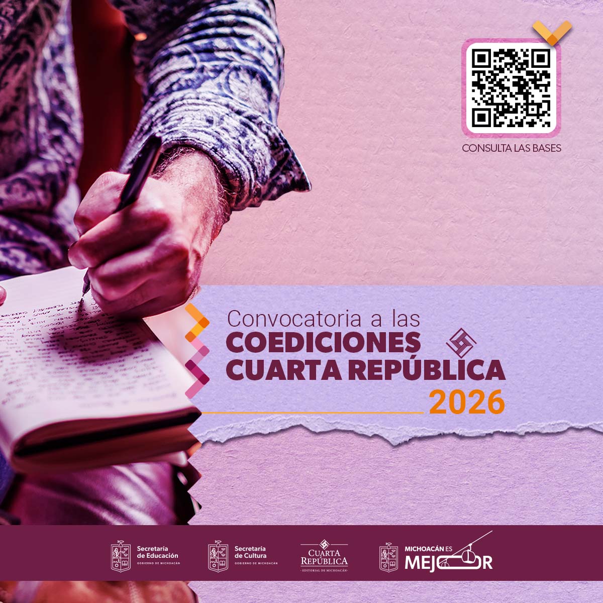 A editoriales independientes nacionales y estatales, así como personas físicas que puedan acreditar actividad en el rubro editorial, para que presenten una propuesta de libro concluido que pueda ser publicado en coedición con Cuarta República. Editorial de Michoacán.