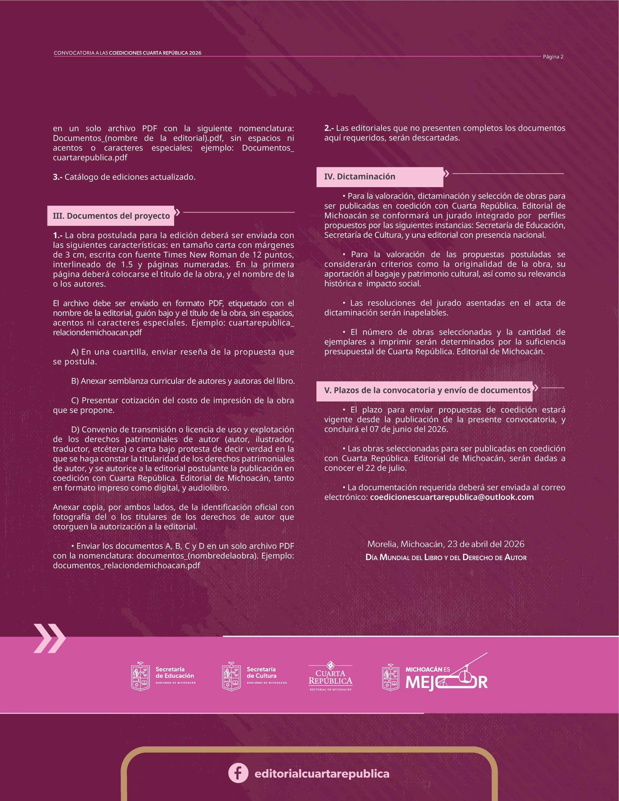 Cuarta República. Editorial de Michoacán se encargará de contratar los servicios de impresión para la publicación de las obras seleccionadas; las editoriales postulantes realizarán la revisión y corrección del texto original, así como la formación de la maqueta y diseño de forros inicial, los cuales deberán ser validados conforme a los criterios editoriales de la institución convocante.