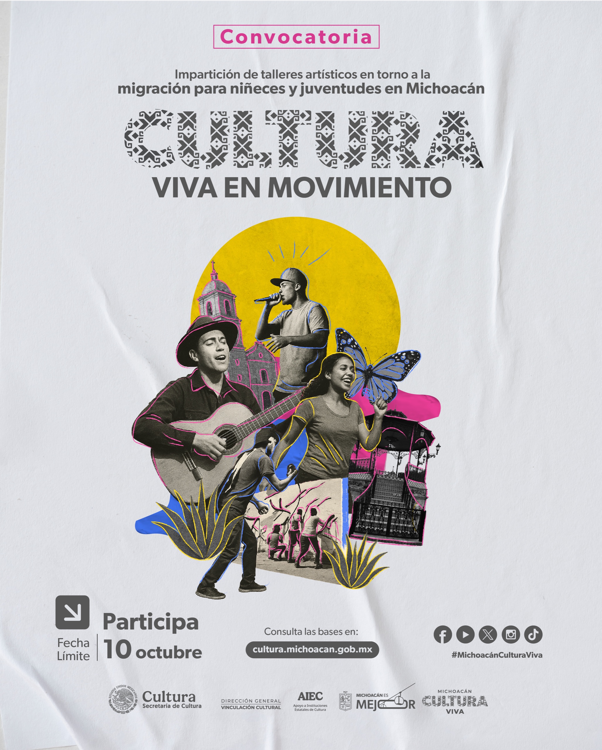 A artistas, personas gestoras y facilitadoras comunitarias con experiencia en procesos de formación artística, creación colectiva y trabajo con niñeces y juventudes migrantes o con experiencia migratoria, a participar en el proceso de selección para integrar tres equipos multidisciplinarios de cuatro integrantes, que impartirán talleres culturales en distintos municipios del estado, de octubre a diciembre de 2025, como parte del proyecto CULTURA VIVA EN MOVIMIENTO