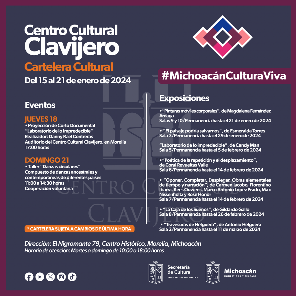 A lo largo de esa semana también puedes darte una vuelta por la diversidad de exposiciones que ofrecen los recintos y museos, entre ellos el Museo del Estado, que recientemente recibió Yucas; y “El paisaje podría salvarnos”, de Esmeralda Torres, que se exhibirá en la Sala 3 del Centro Cultural Clavijero hasta el 29 de enero.