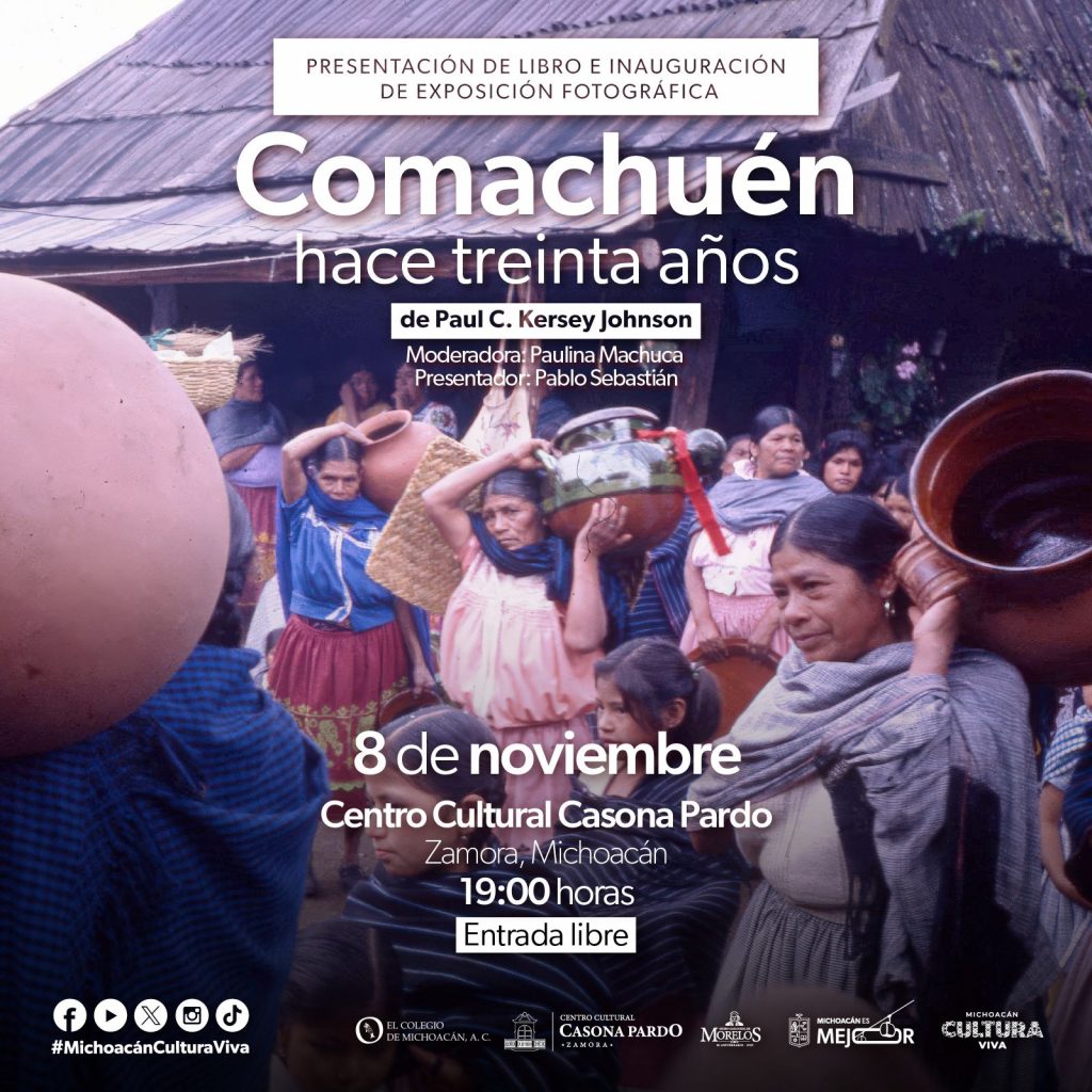 Zamora, Michoacán, 5 de noviembre de 2025.- La Secretaría de Cultura de Michoacán (Secum) invita a la presentación del libro y exposición fotográfica “Comachuén hace treinta años”, del investigador y fotógrafo Paul C. Kersey Johnson, este 8 de noviembre a las 19:00 horas en el Centro Cultural Casona Pardo, con entrada libre.