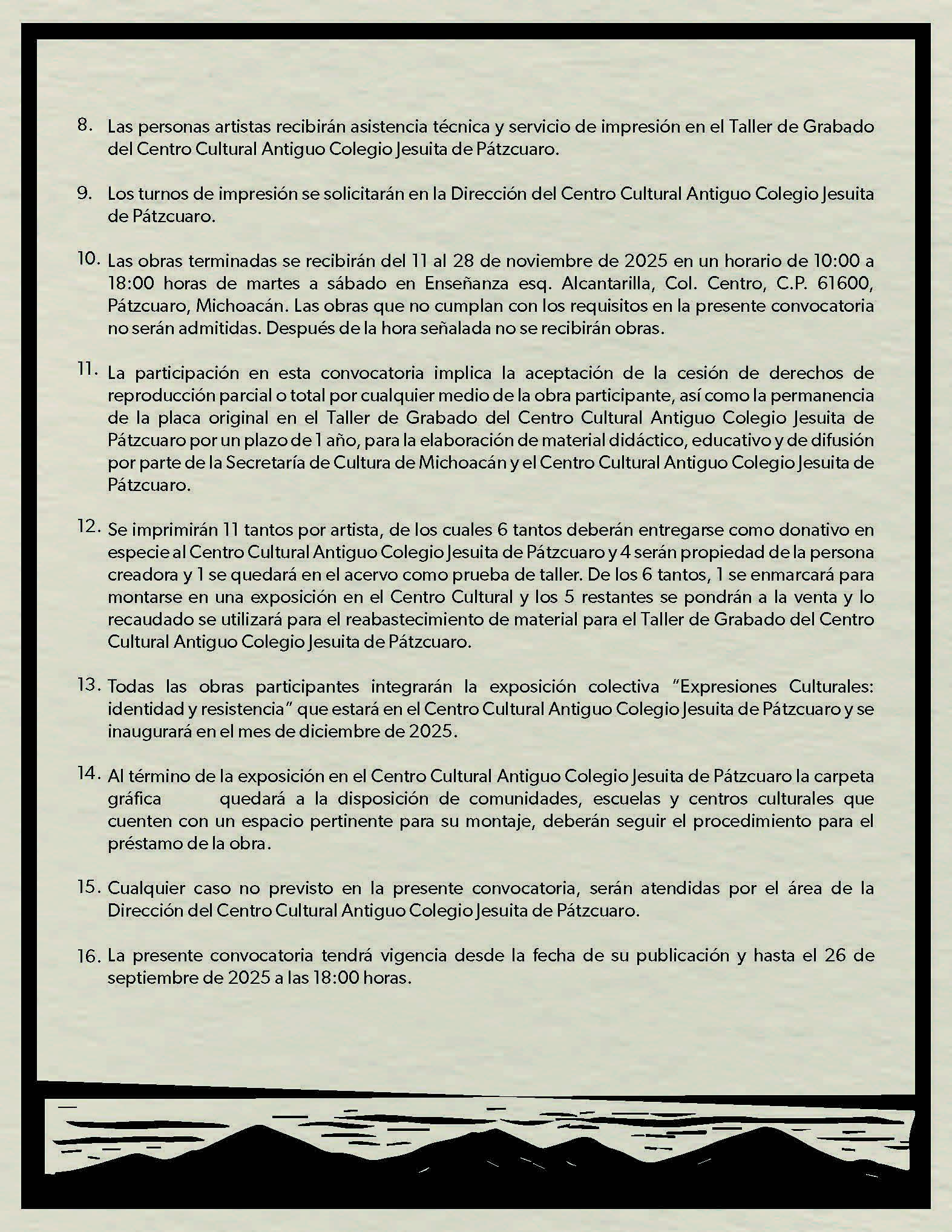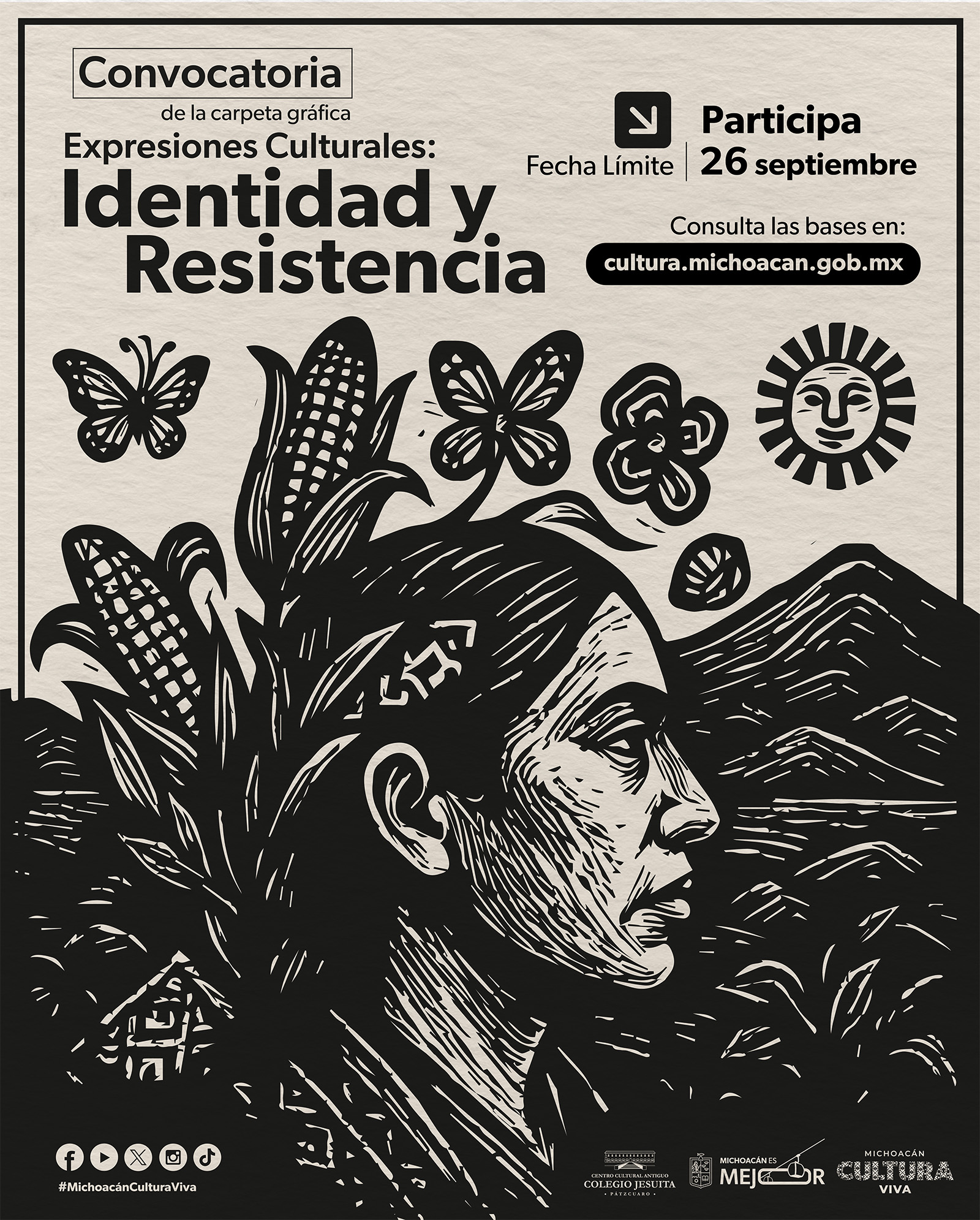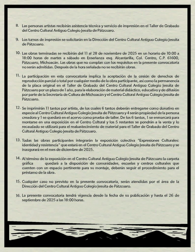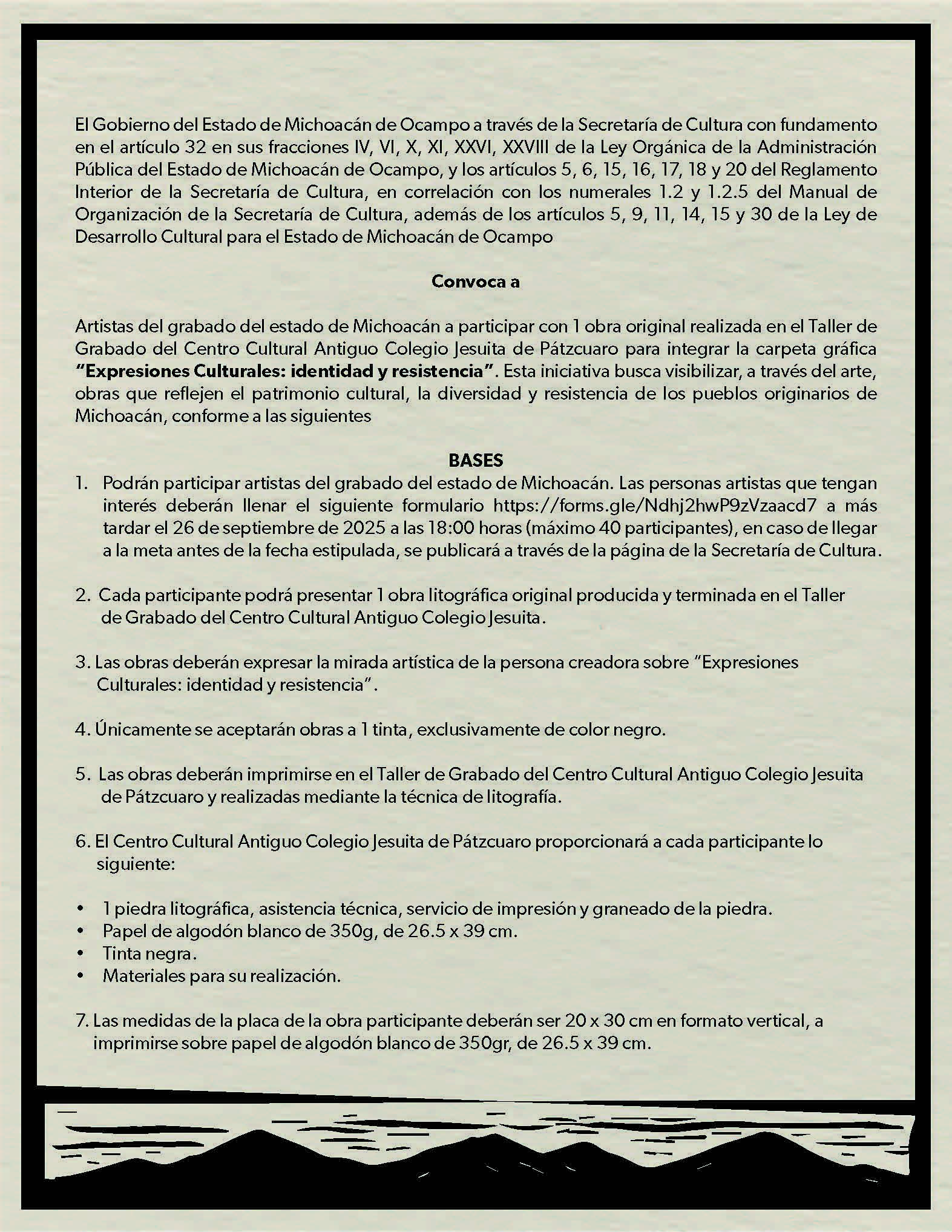 Artistas del grabado del estado de Michoacán a participar con 1 obra original realizada en el Taller de Grabado del Centro Cultural Antiguo Colegio Jesuita de Pátzcuaro para integrar la carpeta gráfica “Expresiones Culturales: identidad y resistencia”. Esta iniciativa busca visibilizar, a través del arte, obras que reflejen el patrimonio cultural, la diversidad y resistencia de los pueblos originarios de Michoacán, conforme a las siguientes