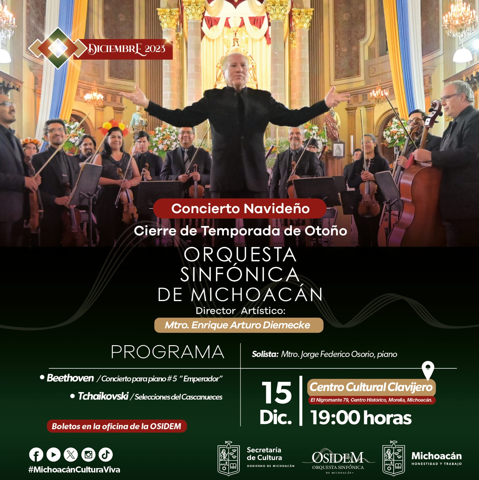 Morelia, Michoacán, 11 de diciembre de 2023.- Gran concierto navideño ofrecerá la Orquesta Sinfónica de Michoacán (Osidem) en el Centro Cultural Clavijero, el próximo viernes 15 de diciembre, en el marco de cierre de su Temporada de Otoño 2023.