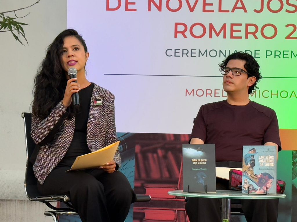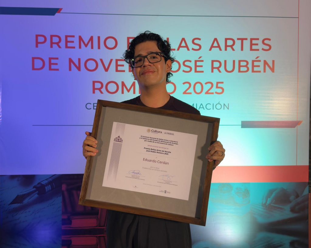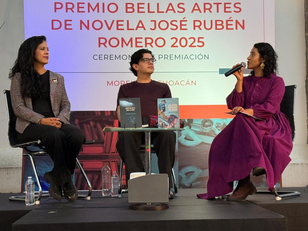 Morelia, Michoacán, 22 de octubre de 2025.- El escritor Eduardo Cerdán fue oficialmente reconocido con el Premio Bellas Artes de Novela “José Rubén Romero” 2025 por su obra “El pánico fue un cachorro dormido”. La entrega del galardón, que incluye un estímulo económico de 200 mil pesos y un diploma, fue realizada por la Secretaría de Cultura federal, el Instituto Nacional de Bellas Artes y Literatura (INBAL) y la Secretaría de Cultura de Michoacán (Secum).