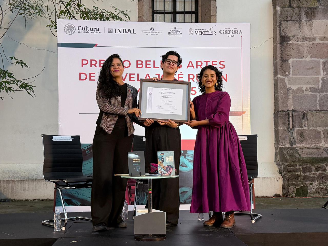 Morelia, Michoacán, 22 de octubre de 2025.- El escritor Eduardo Cerdán fue oficialmente reconocido con el Premio Bellas Artes de Novela “José Rubén Romero” 2025 por su obra “El pánico fue un cachorro dormido”. La entrega del galardón, que incluye un estímulo económico de 200 mil pesos y un diploma, fue realizada por la Secretaría de Cultura federal, el Instituto Nacional de Bellas Artes y Literatura (INBAL) y la Secretaría de Cultura de Michoacán (Secum).