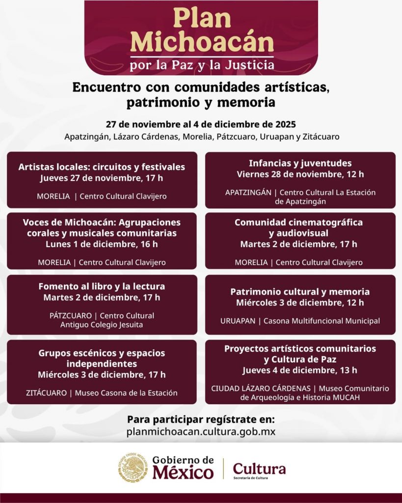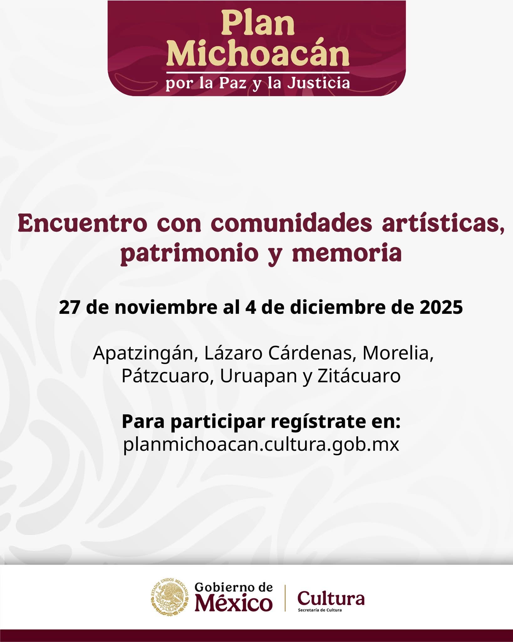 Morelia, Michoacán, 25 de noviembre del 2025.- La Secretaría de Cultura de Michoacán (Secum) informa que ya está abierto el registro para el encuentro “Comunidades artísticas, patrimonio y memoria”, que se realizará del 27 de noviembre al 4 de diciembre de 2025, como parte del Plan Michoacán por la Paz y la Justicia.