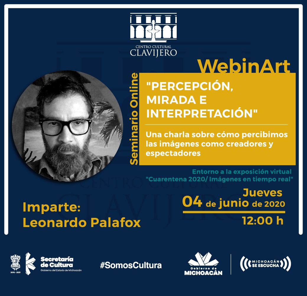 Morelia, Michoacán, a 29 de mayo de 2020.- Como parte de su programación digital, la Secretaría de Cultura del Estado de Michoacán, a través del Centro Cultural Clavijero llevará a cabo la charla “Percepción, mirada e interpretación”, que se llevará a cabo el próximo jueves 04 de junio, a mediodía, y será impartido por Leonardo Palafox.
