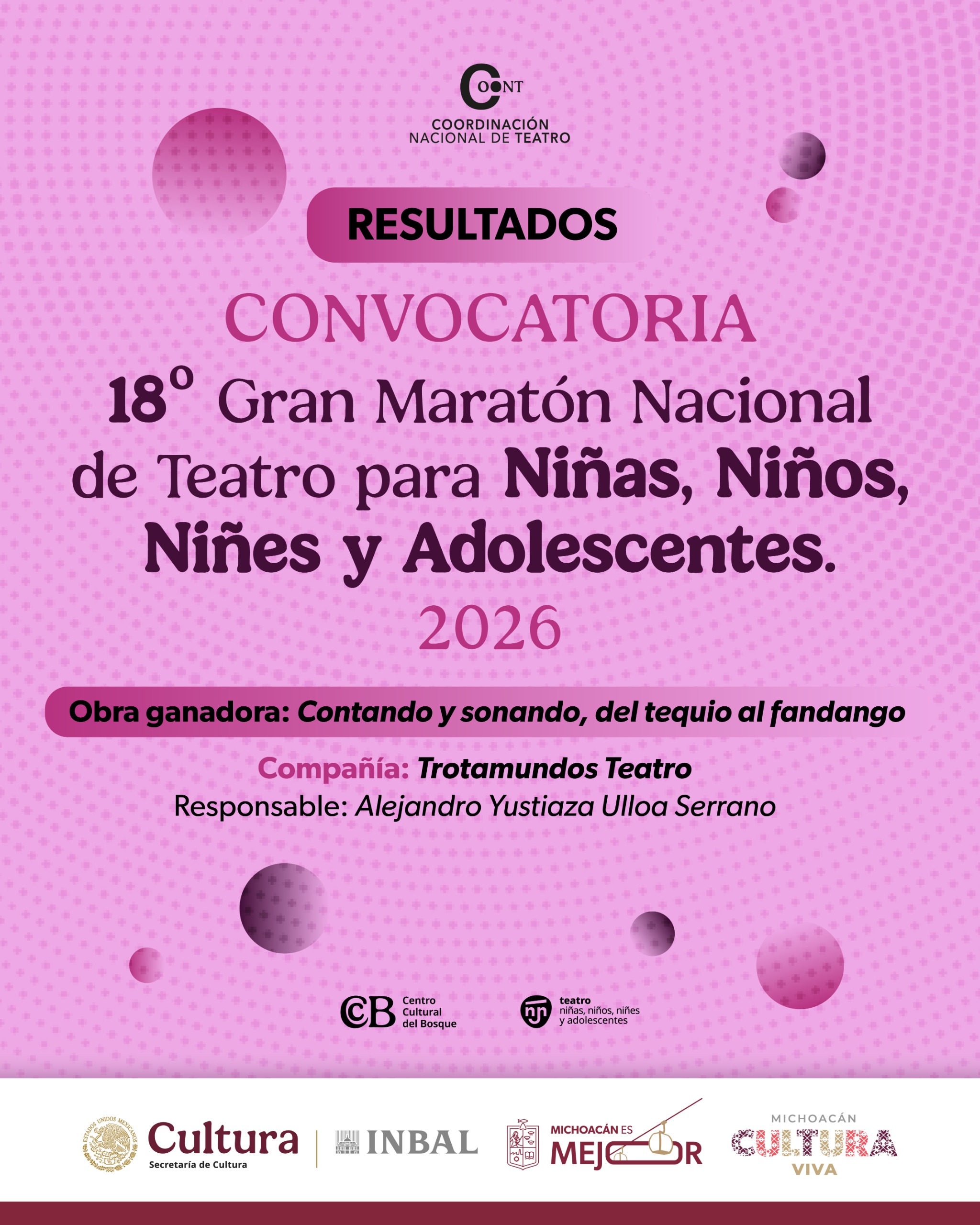 La Secretaría de Cultura de Michoacán, la Dirección de Promoción y Fomento Cultural y su Departamento de Teatro, dan a conocer el resultado de la convocatoria del 18° Gran Maratón Nacional de Teatro para niñas, niños, niñes y adolescentes.