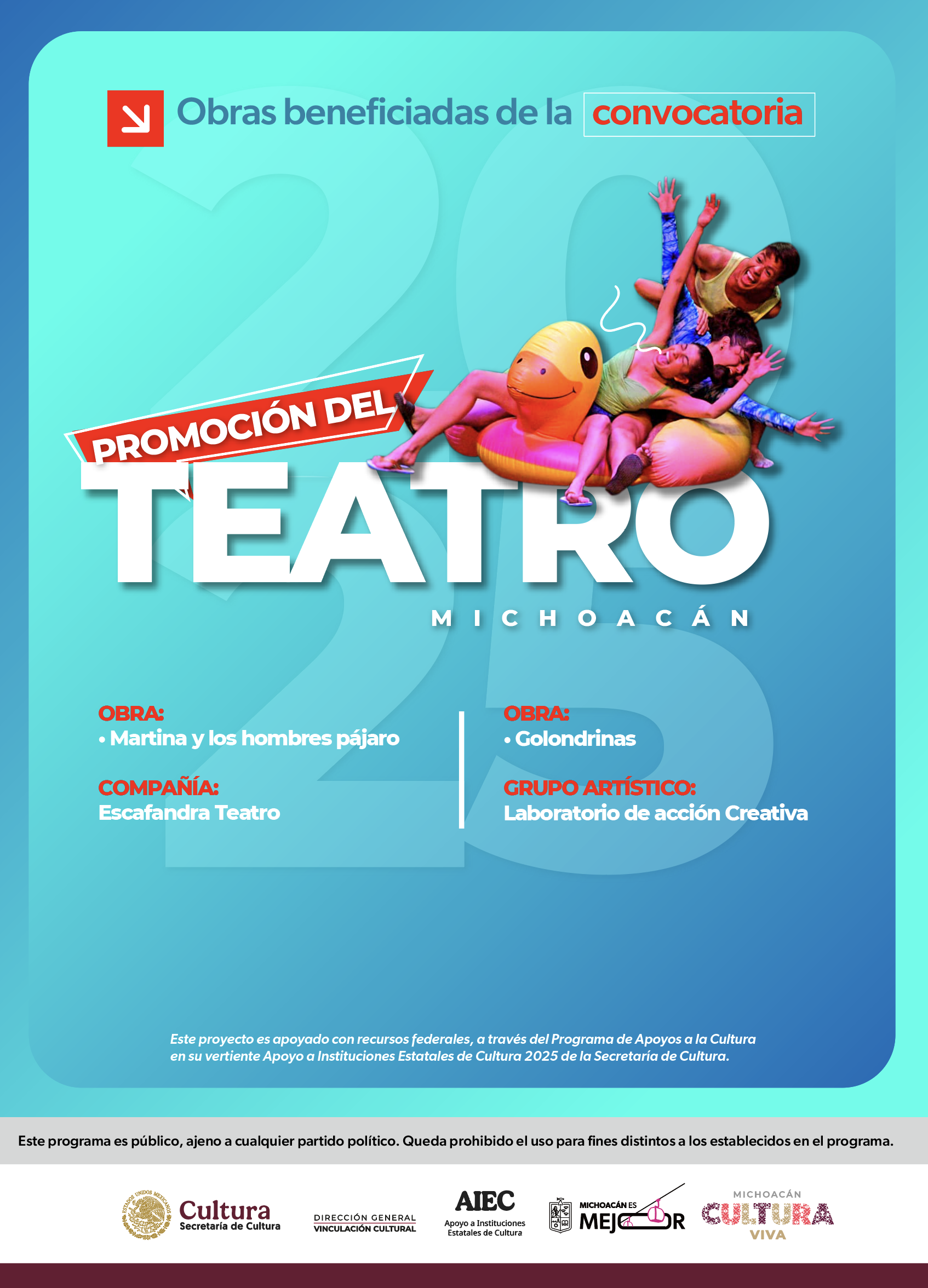 La Secretaría de Cultura de Michoacán, la Dirección de Promoción y Fomento Cultural y su Departamento de Teatro, dan a conocer el resultado de la convocatoria de Promoción del Teatro en Michoacán 2025