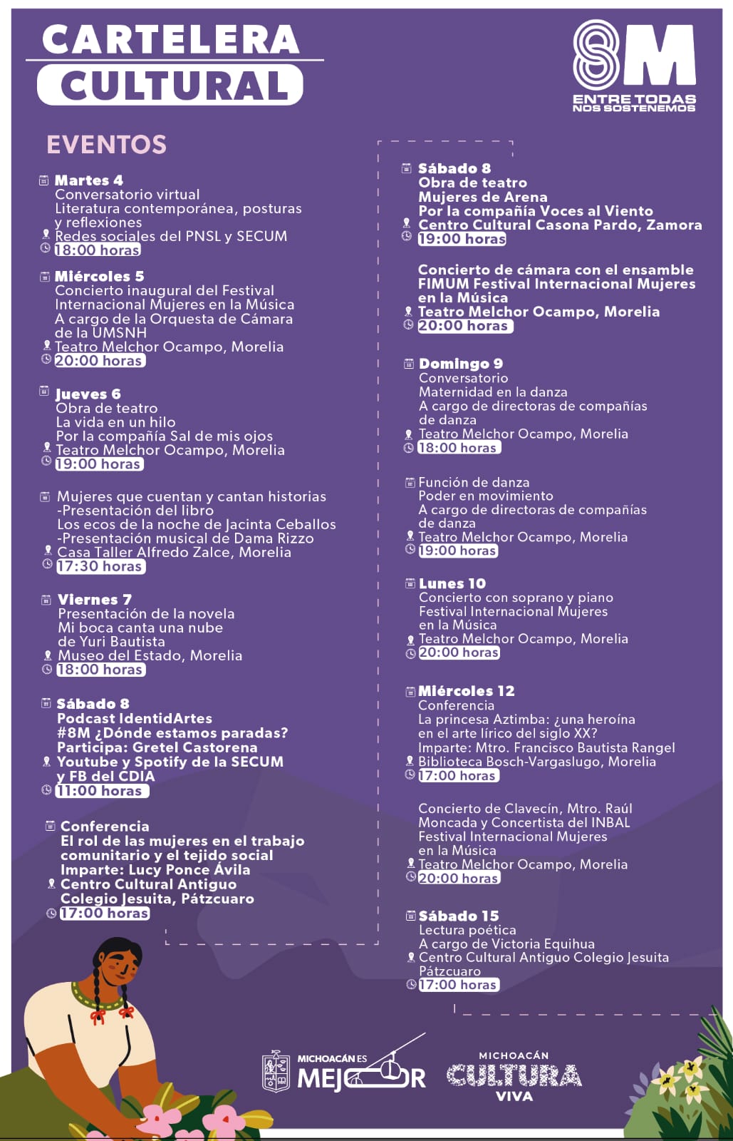 Morelia, Michoacán, 4 de marzo de 2025.- La Secretaría de Cultura de Michoacán (Secum) conmemorará el Día Internacional de la Mujer con una cartelera de actividades que incluyen talleres, conferencias, obras de teatro, conversatorios y la entrega de reconocimientos a mujeres de diversas comunidades, con el propósito de visibilizar su labor en el ámbito creativo y artístico.