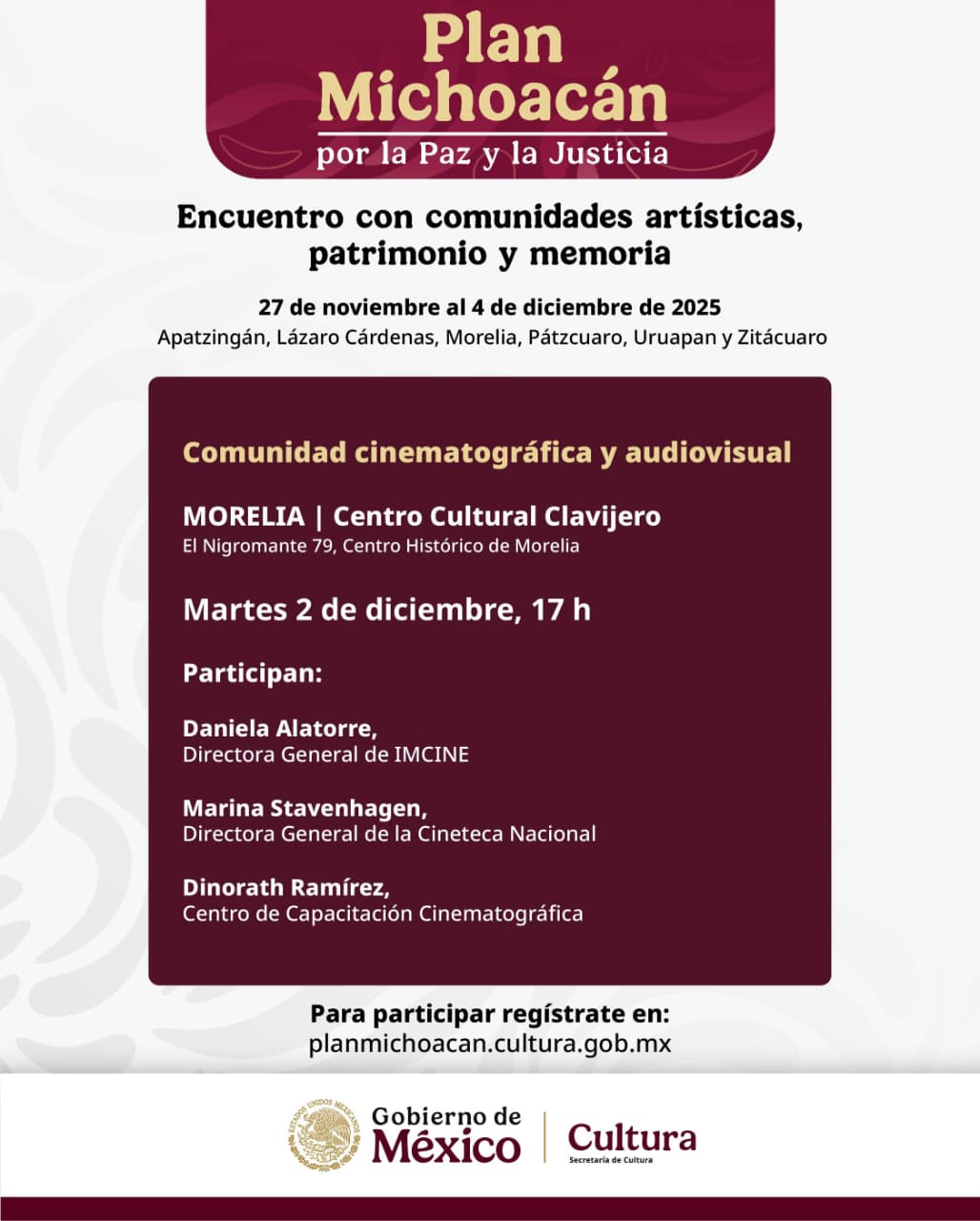 Ese mismo día, también a las 17:00 horas, Morelia será sede del encuentro con la comunidad cinematográfica y audiovisual, que se llevará a cabo en el Centro Cultural Clavijero. La reunión contará con la presencia de las directoras generales del Instituto Mexicano de Cinematografía, Daniela Alatorre; de la Cineteca Nacional, Marina Stavenhagen, y del Centro de Capacitación Cinematográfica, Dinorath Ramírez, para dialogar sobre formación, producción y redes de colaboración desde un enfoque comunitario.