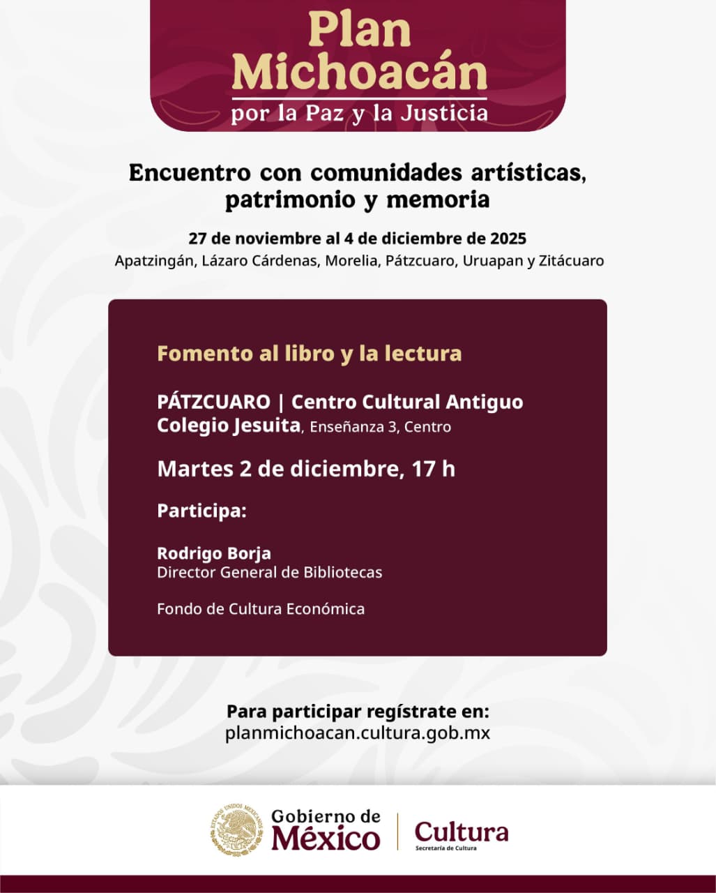 Este martes 2 de diciembre se llevarán a cabo dos sesiones dedicadas a fortalecer la articulación cultural en el estado. La primera tendrá lugar en Pátzcuaro, en el Centro Cultural Antiguo Colegio Jesuita, donde a las 17:00 horas se desarrollará la mesa de Fomento al libro y la lectura. Participará Rodrigo Borja, director general de Bibliotecas del Fondo de Cultura Económica, quien compartirá perspectivas y estrategias para impulsar la lectura desde una visión comunitaria y de acceso libre al conocimiento.
