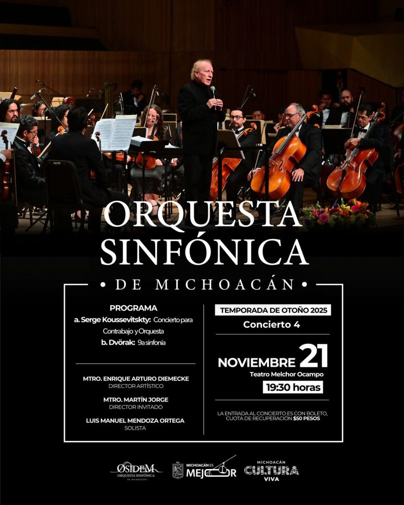 Morelia, Michoacán, 18 de noviembre de 2025.- La Secretaría de Cultura de Michoacán (Secum) invita al cuarto concierto de temporada de la Orquesta Sinfónica de Michoacán (Osidem) este viernes 21 de noviembre a las 19:30 horas en el Teatro Melchor Ocampo, con un programa que incluye el Concierto para Contrabajo y Orquesta de Serge Koussevitzky y la Novena Sinfonía de Antonín Dvořák, dos obras esenciales del repertorio sinfónico.
