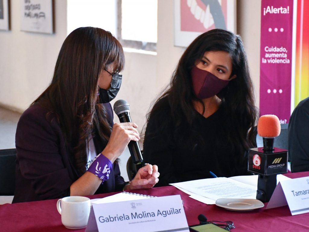 Morelia, Michoacán, a 01 de marzo del 2022.- Gabriela Molina Aguilar, titular de la Secretaria de Cultura (Secum) y Tamara Sosa Alanís, secretaria de Igualdad Sustantiva y Desarrollo de las Mujeres Michoacanas, presentaron la agenda cultural 8M 2022 “Mujeres Creadoras” que incluye actividades de diversas disciplinas, como artes plásticas, cine, danza y literatura.