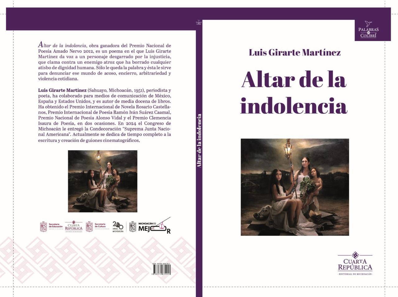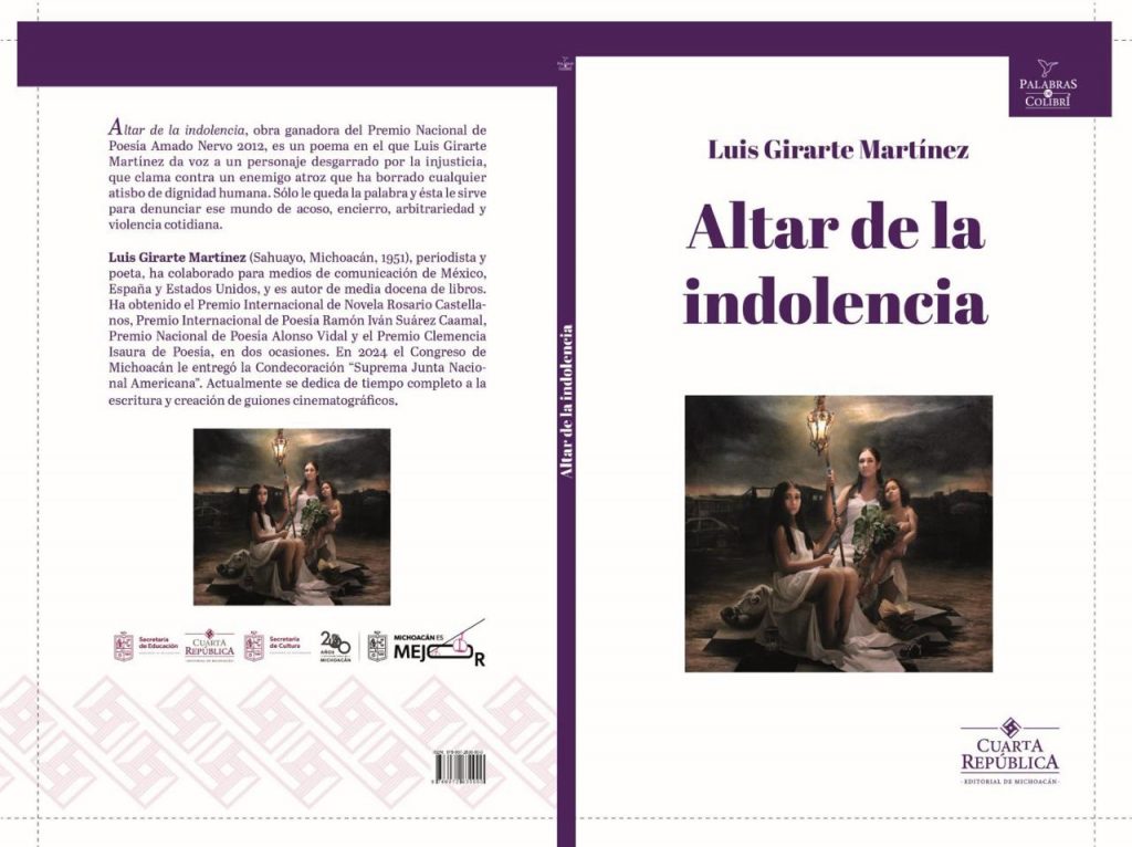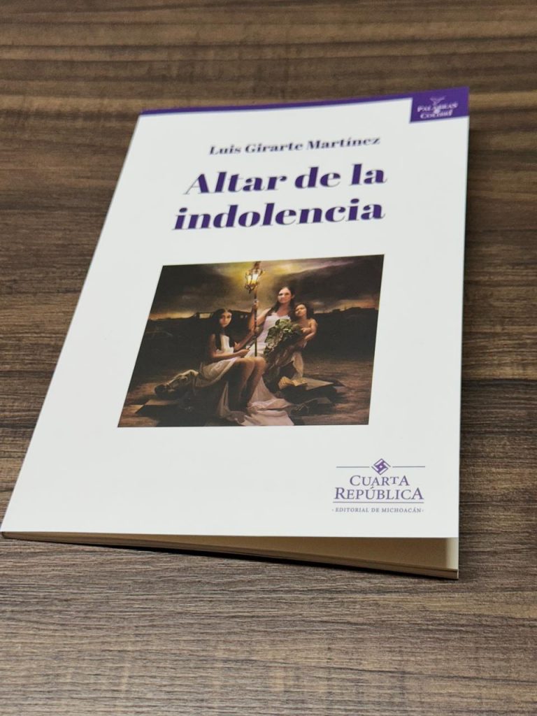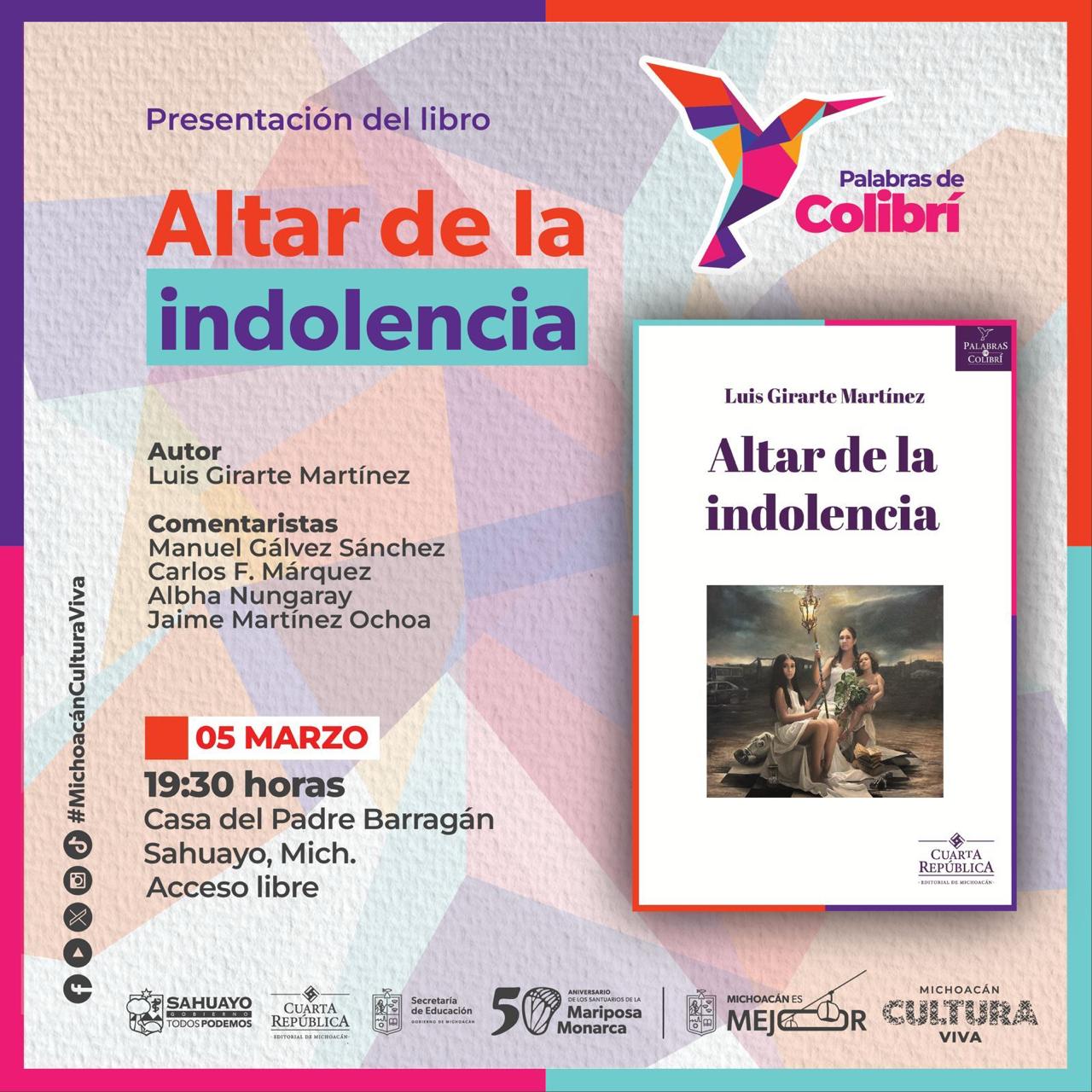 Morelia, Michoacán, 3 de marzo de 2025.- La Secretaría de Educación en el Estado (SEE) y la Secretaría de Cultura de Michoacán (SECUM) se complacen en anunciar la presentación del libro “Altar de la indolencia”, una obra del reconocido poeta Luis Girarte Martínez, publicada bajo el sello de Cuarta República, Editorial de Michoacán. Este evento será de entrada libre y tendrá lugar el 5 de marzo a las 19:30 horas en la Casa del Padre Barragán, ubicada en Sahuayo, Michoacán.