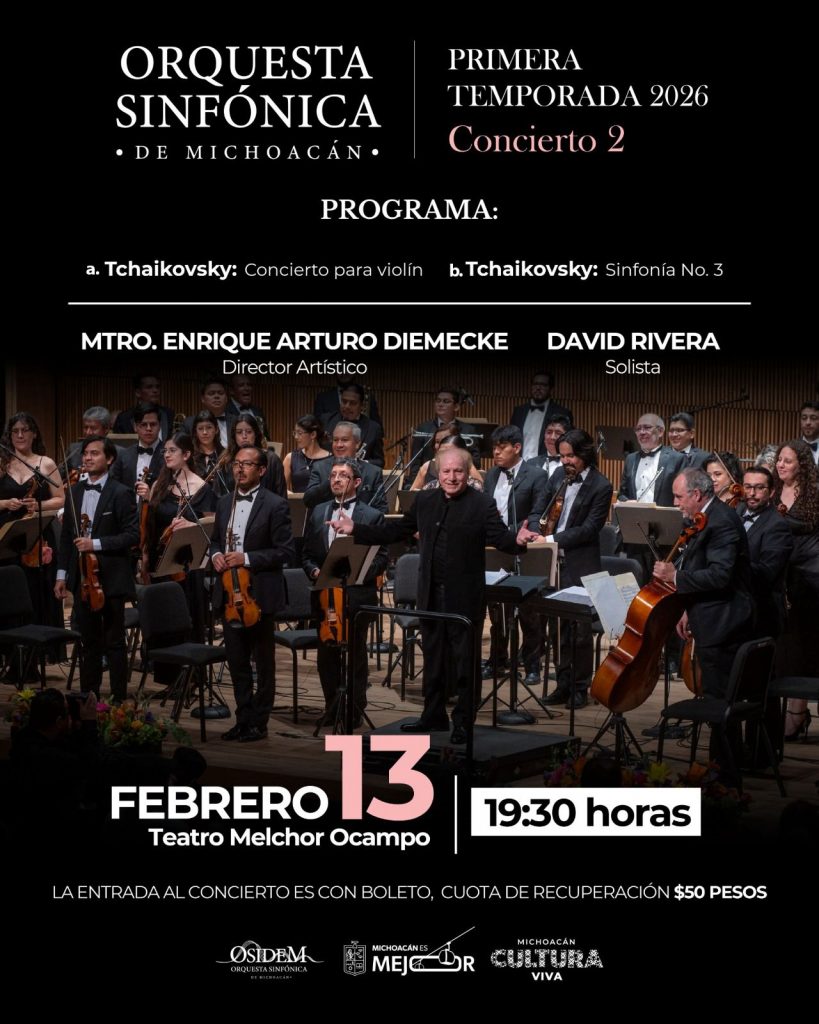 Morelia, Michoacán, 10 de febrero de 2026.- La Orquesta Sinfónica de Michoacán (Osidem) ofrecerá una velada dedicada al romanticismo europeo con obras de Weber y Tchaikovsky, este viernes 13 de febrero a las 19:30 horas en el Teatro Melchor Ocampo, como parte del segundo concierto de la Primera Temporada 2026.